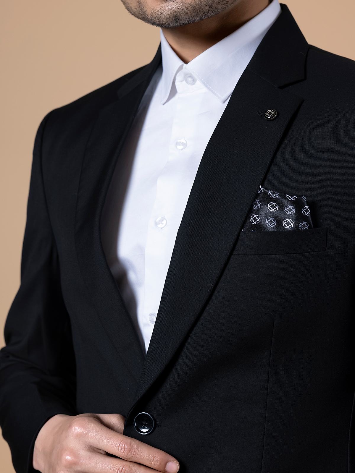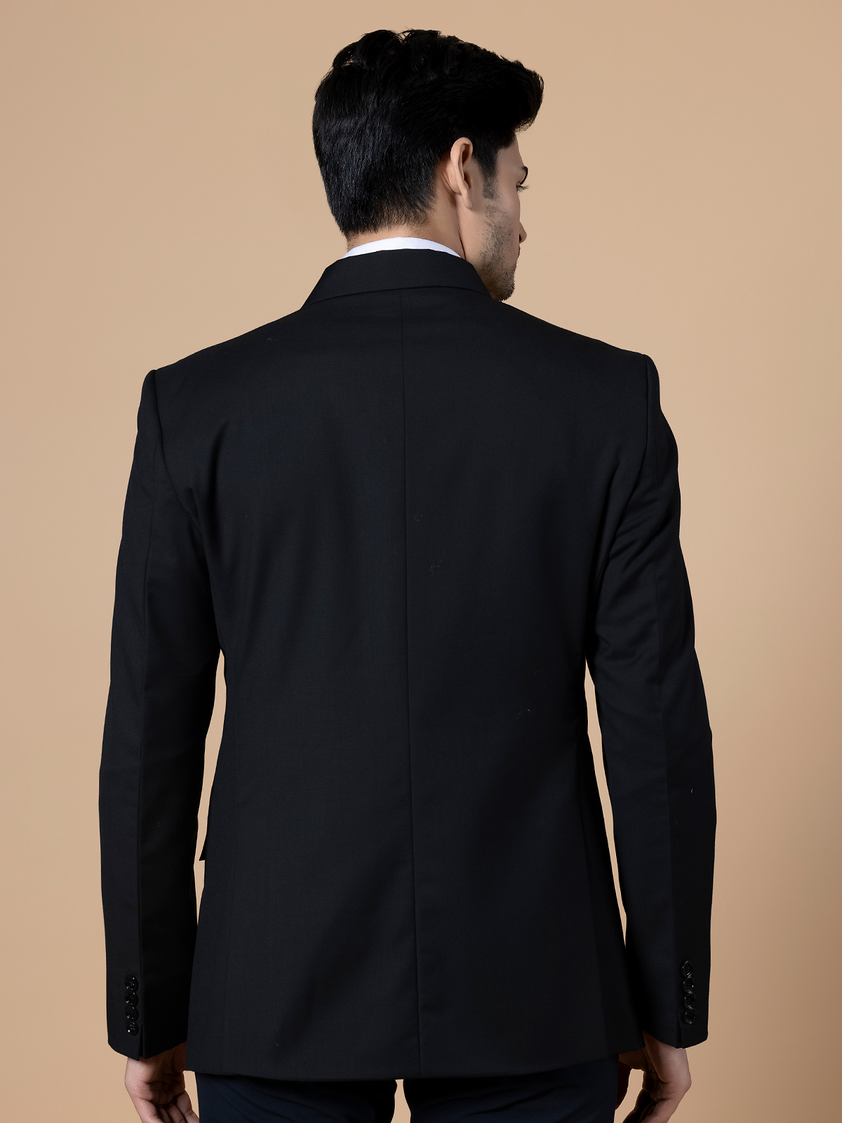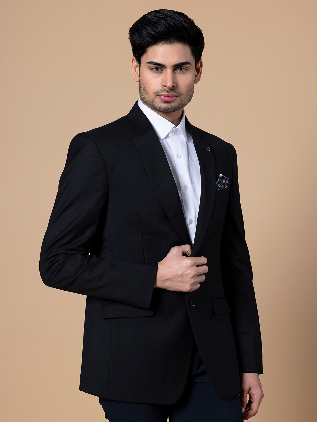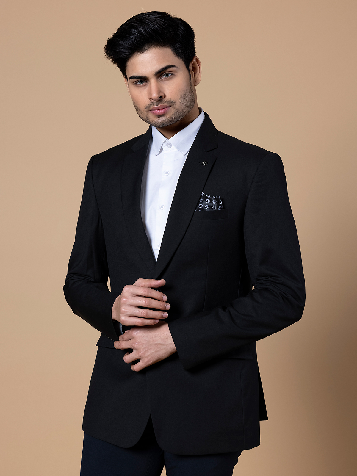 This classic black solid terry rayon blazer is designed with notch lapel collar, full sleeves, two buttoned placket, two welt pockets with flap and a pocket tie. The shirt is only for photoshoot purpose.