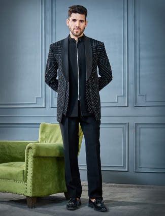 Black Embroidered Terry Rayon Coat Suit