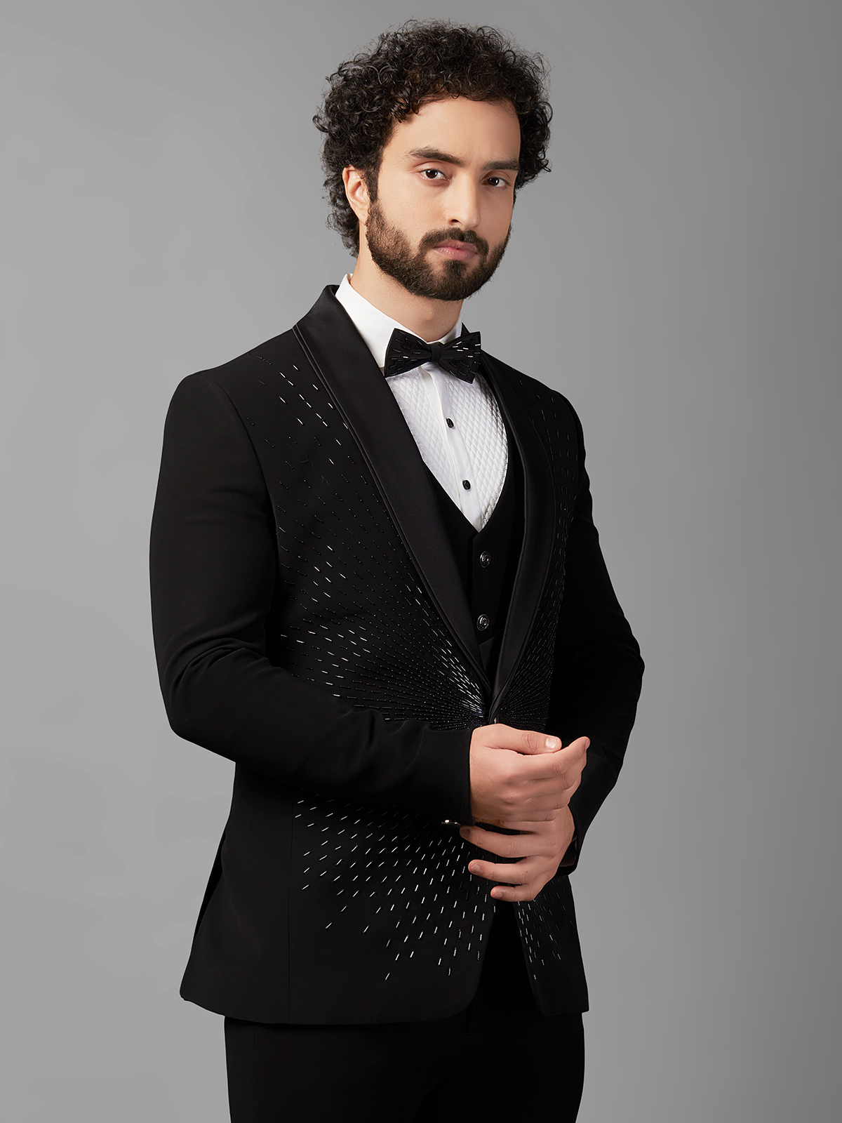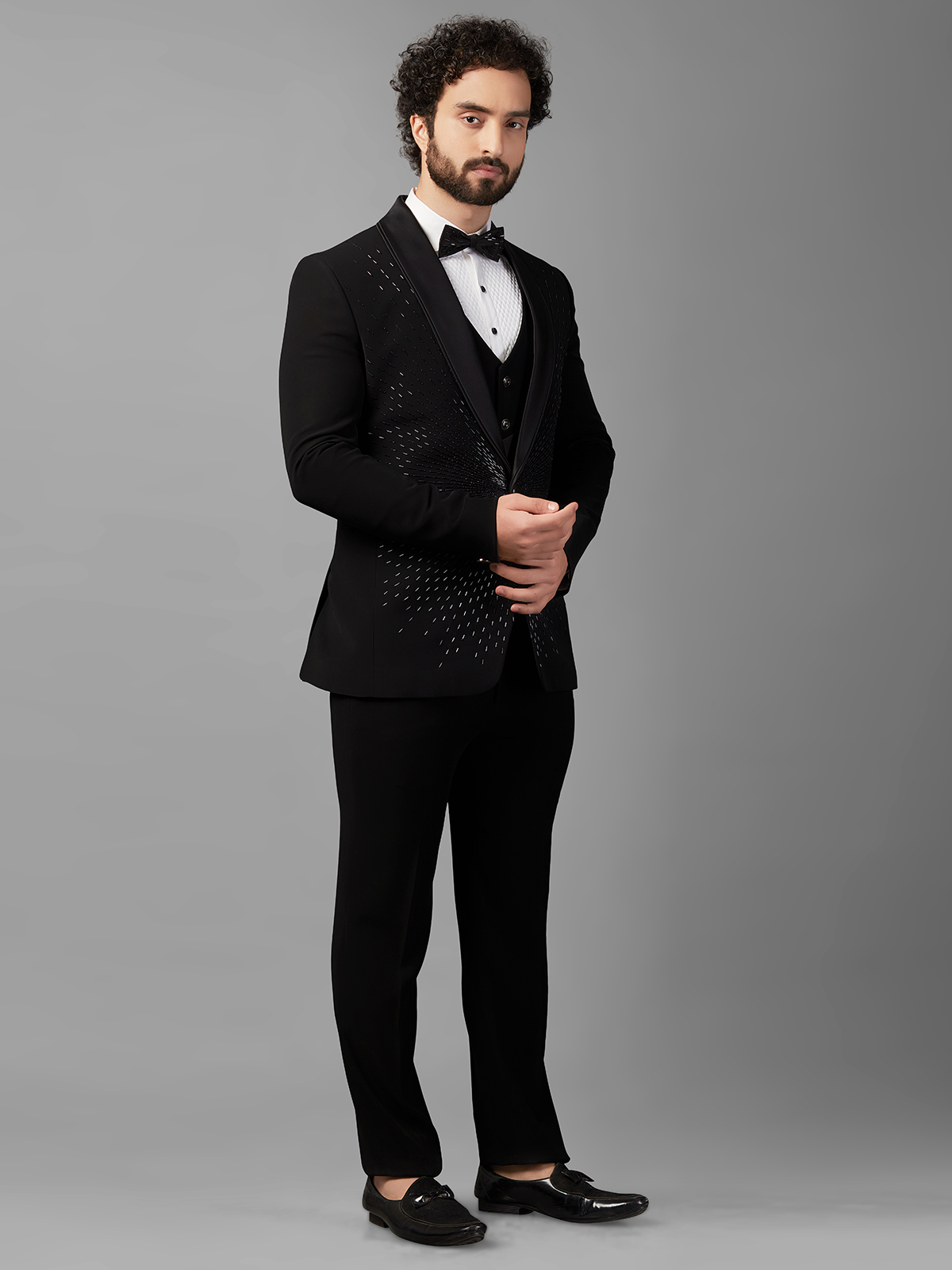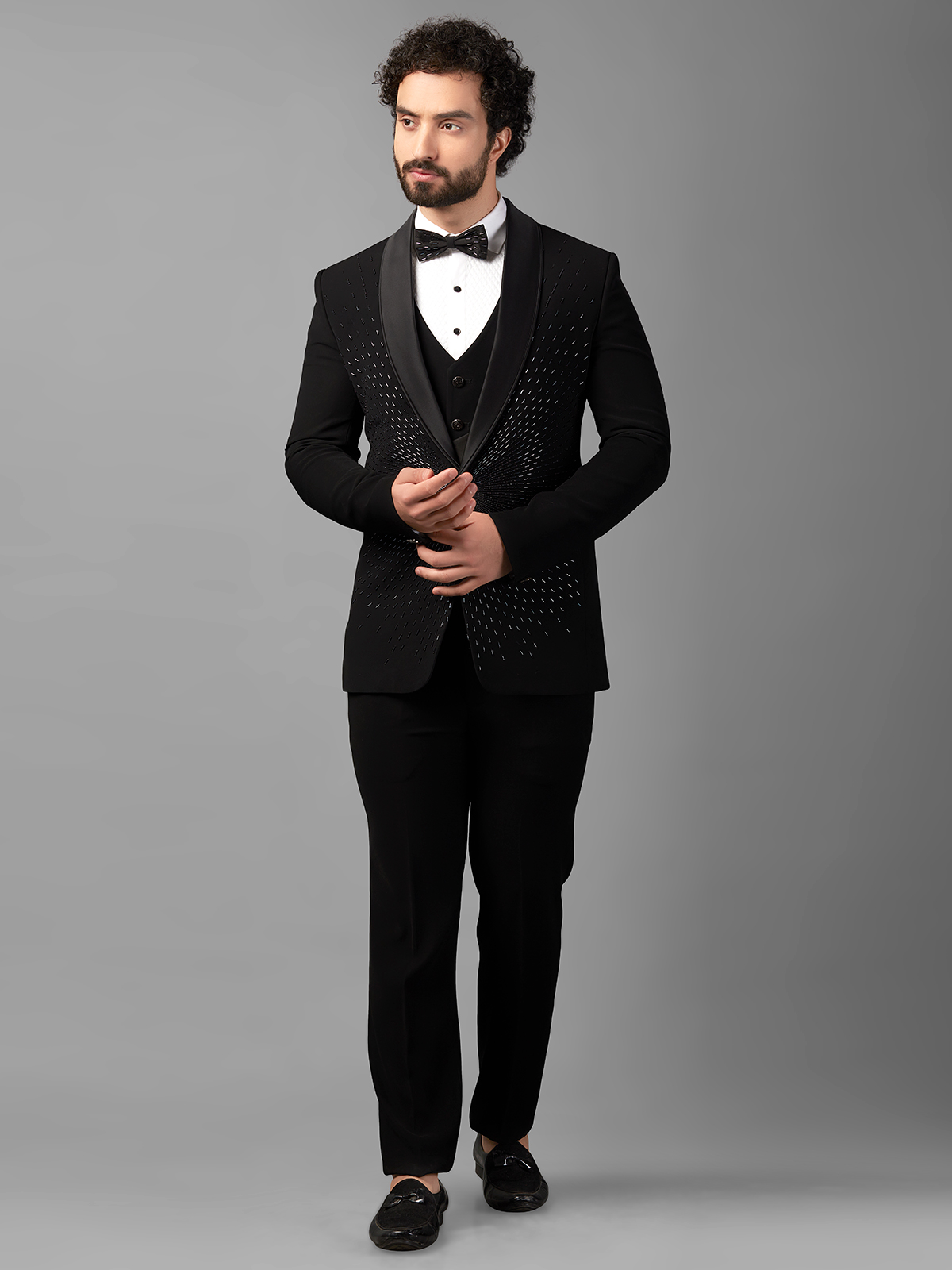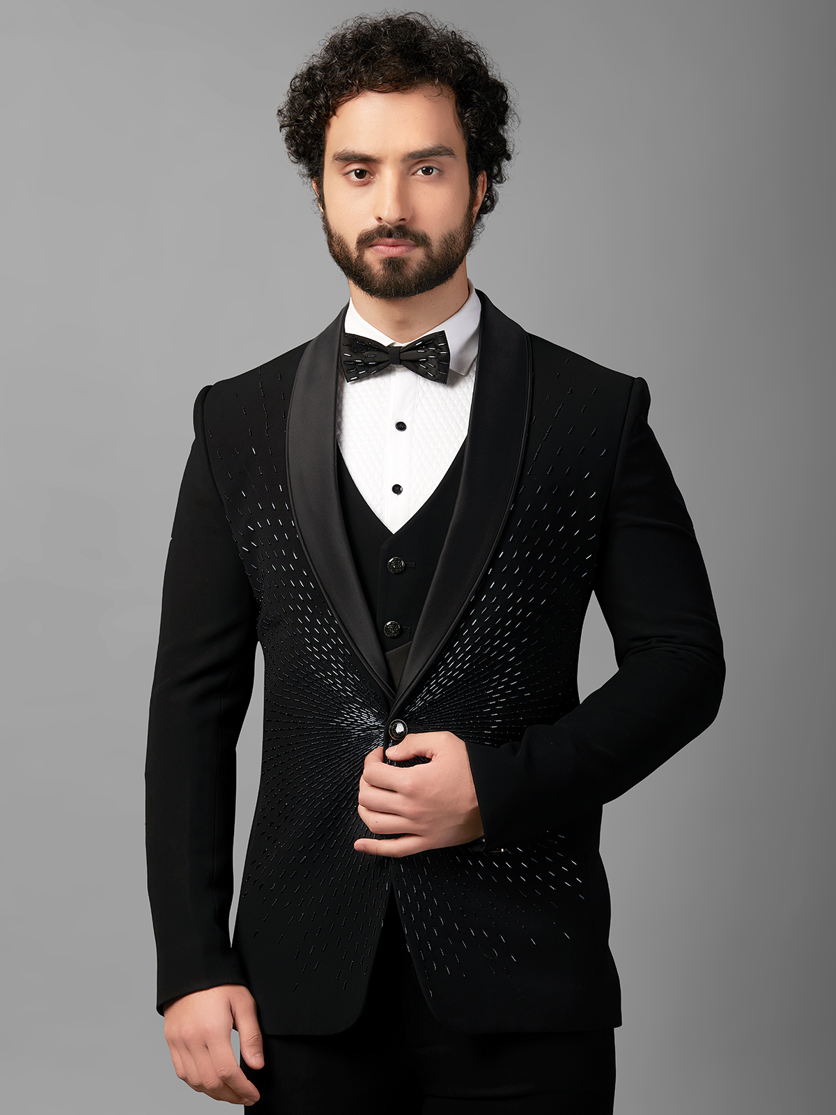 Make a stylish statement at parties and receptions with a dazzling black terry rayon coat suit, featuring intricate cutdana and bead work. Complete with a shawl lapel collar and front button placket. Includes an unstitched bottom.