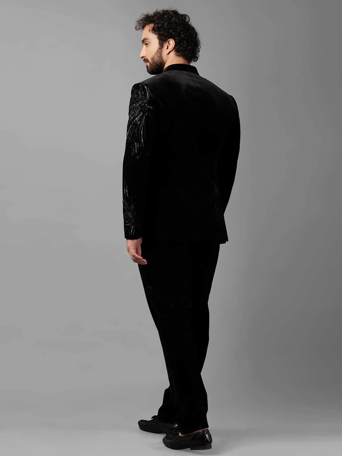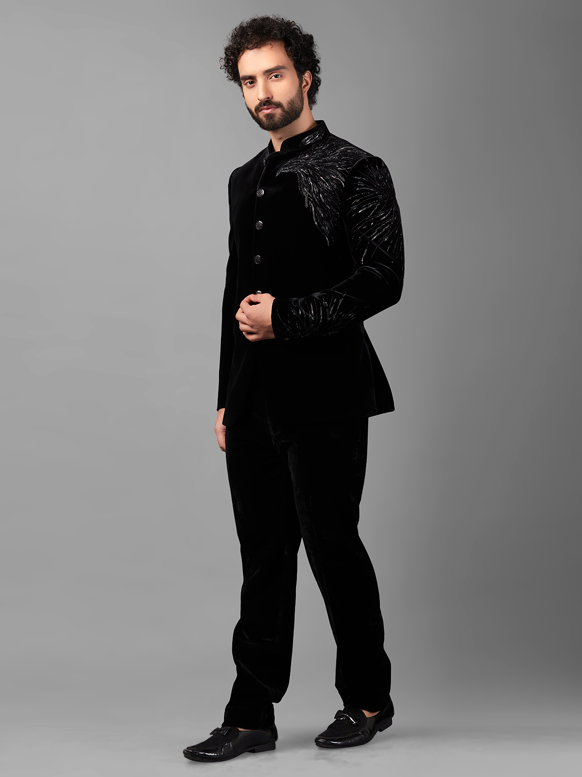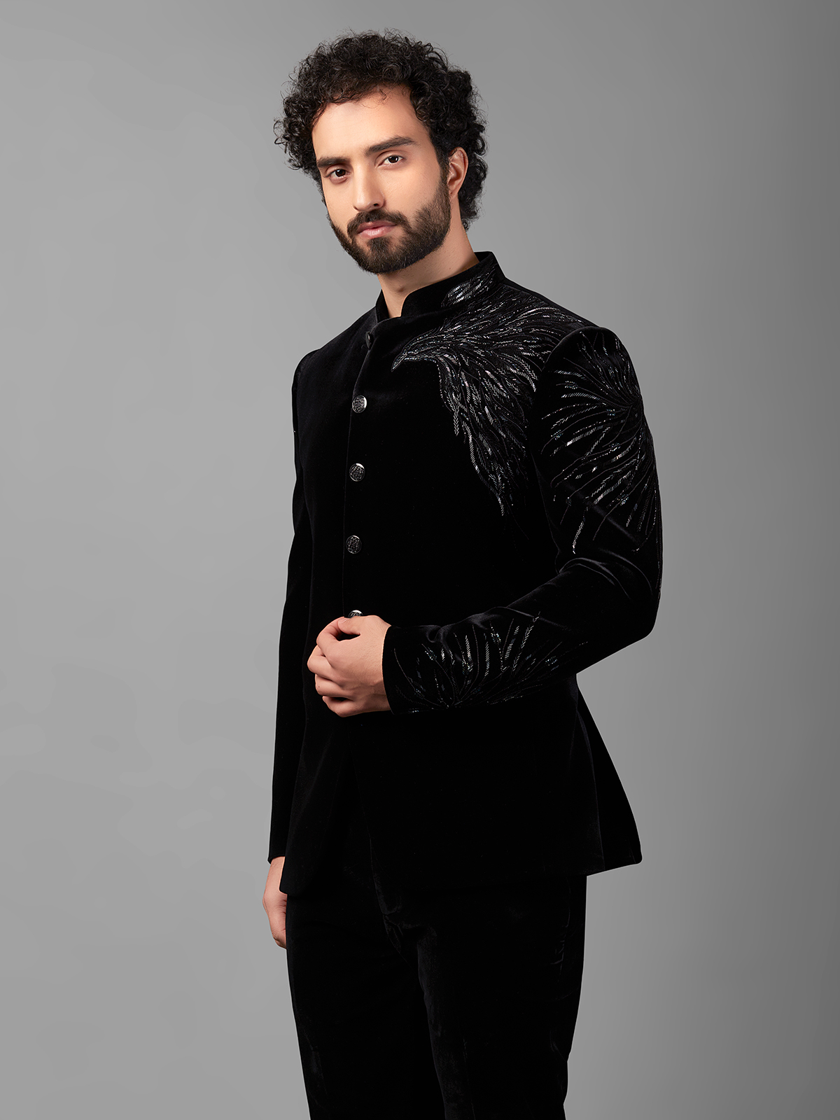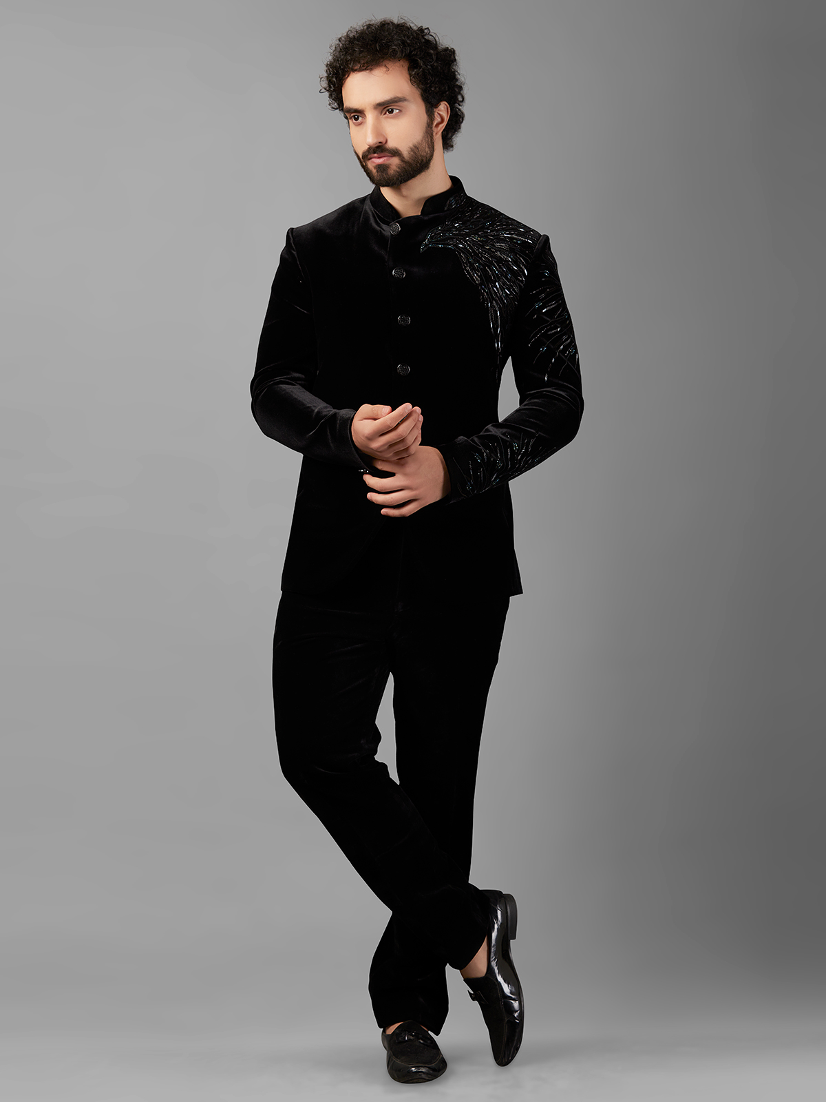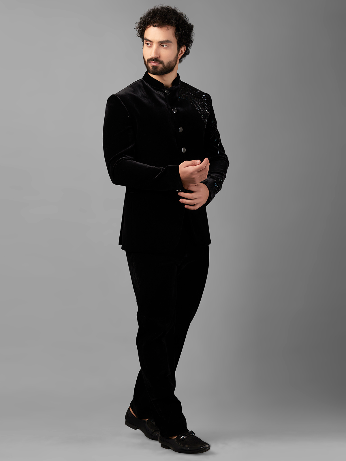 For any special occasion, opt for this black velvet designer jodhpuri suit, adorned with charming cutdana and bead work. Includes an unstitched bottom.