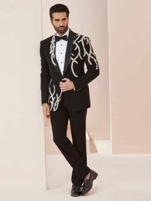 Elevate your style quotient with this classy black solid coat suit made of terry rayon fabric. Embellished with sequins and cutdana work, it features a shawl collar, two welt pockets with a flap, one button closer, and full sleeves pattern. This suit comes with a shirt, bow tie, and unstitched bottom.