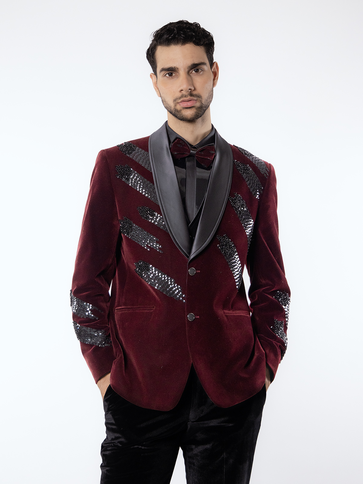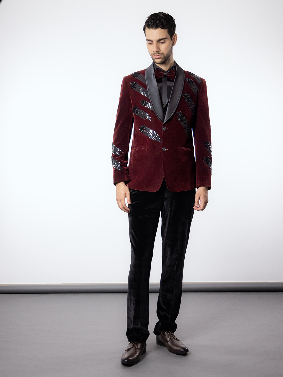 Maroon Velvet Embellished Shawl Lapel Reception Coat Suit