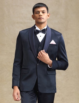 Designed to make a statement, the rich navy suit showcases a timeless shawl lapel collar paired with a clean single-button fastening. Practical yet refined, it includes three functional pockets and matching trousers, blending comfort with enduring style.