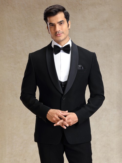 Make a commanding entrance in this impeccably tailored Black tuxedo set. Made from rich polyester with a lustrous sheen, it features a coat with contrasting shawl collar and elegant buttons, paired with a matching waistcoat, shirt, bowtie, pocket square, and trousers. Ideal for black-tie events, this ensemble shines when styled with classic brogues and a bold lapel accessory.