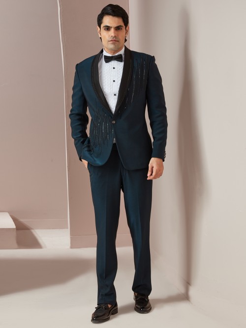 Check out this teal blue coat suit made of terry rayon fabric, with cutdana and beadwork. Featuring a shawl collar, one button closure, and full sleeves, it comes with a shirt, bow tie, and unstitched bottom, making it a perfect pick for the occasion.