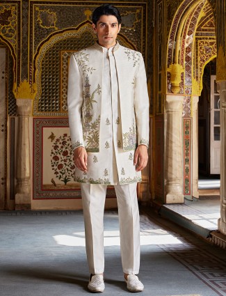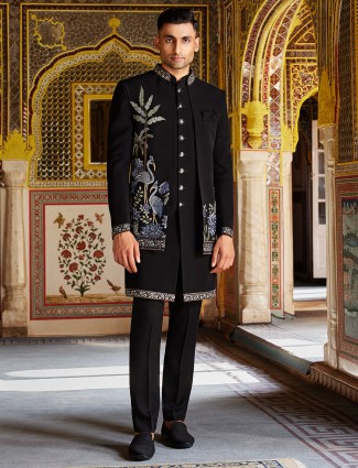 Designed for the man who values elegance, this classic black Indo-western is crafted from rich terry rayon fabric. The subtle thread, resham, embroidery and stone work provide a tasteful finishing touch. With a matching bottom, this piece offers a perfect balance of comfort and luxury.