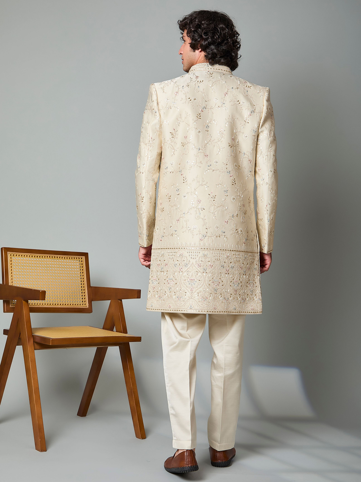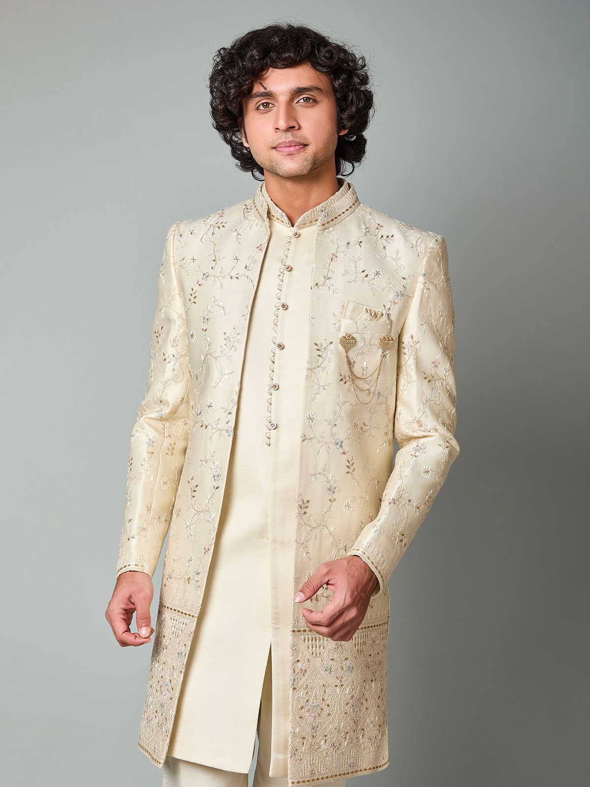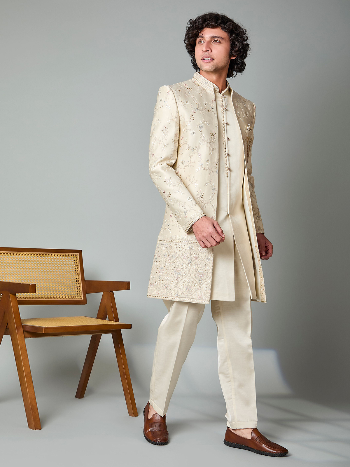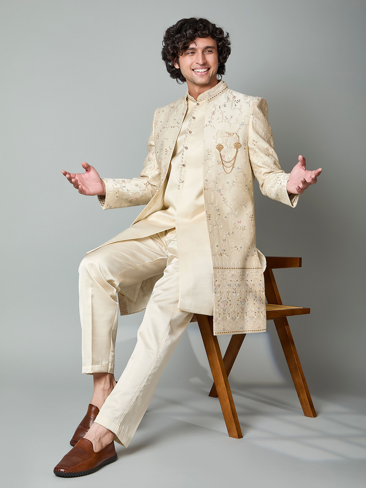 This beige silk Indowestern set is elevated with intricate embroidery and soft sequin detailing. Accented with a refined brooch and tailored pant, it exudes classic elegance, making it perfect for weddings and stylish reception occasions.