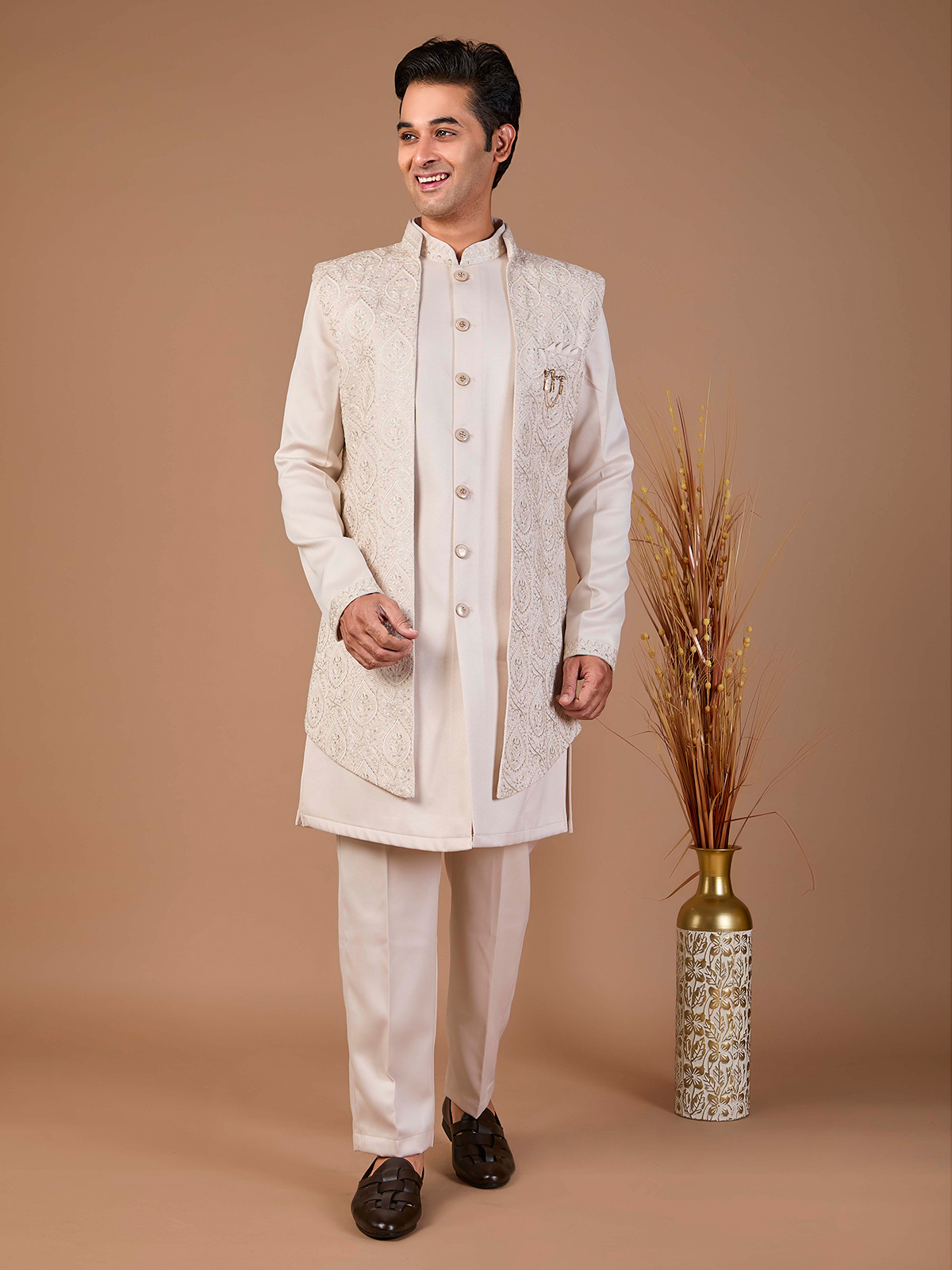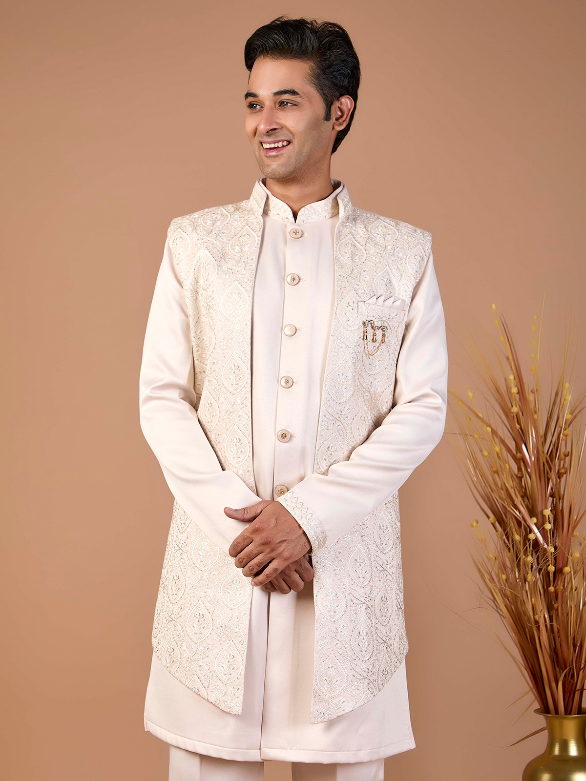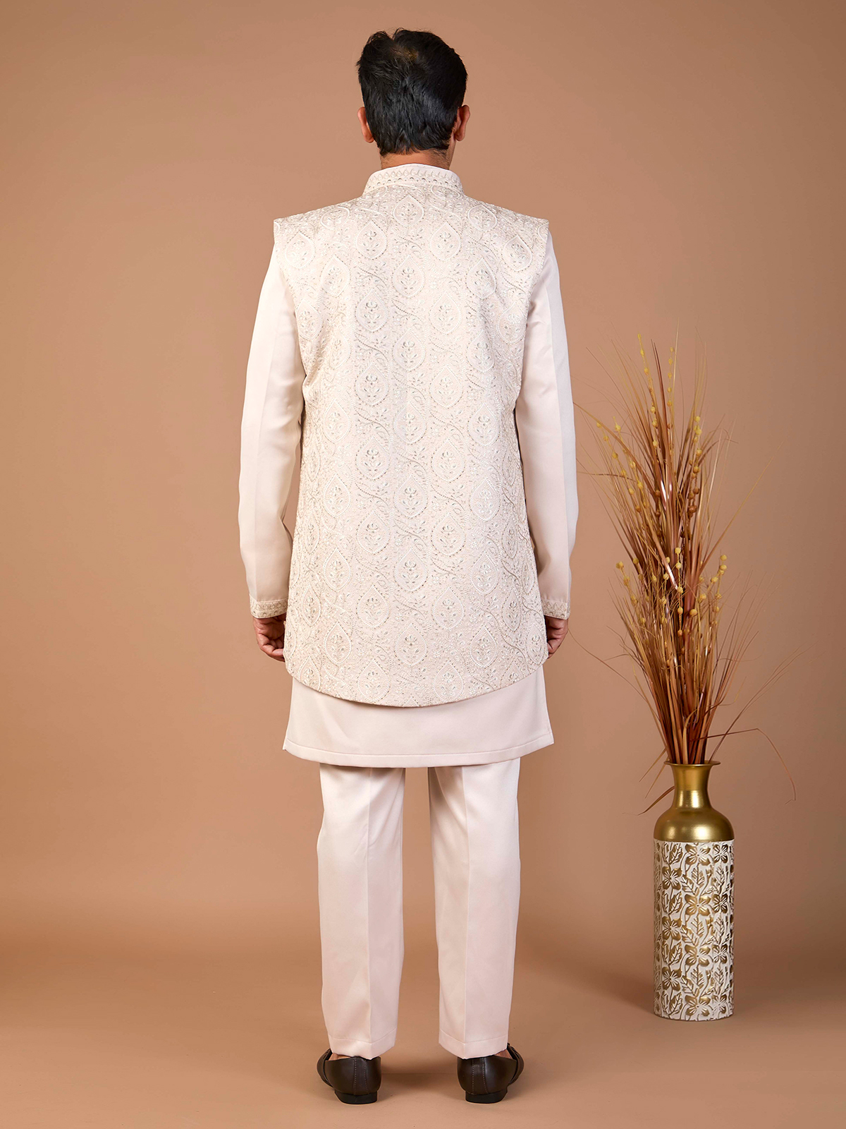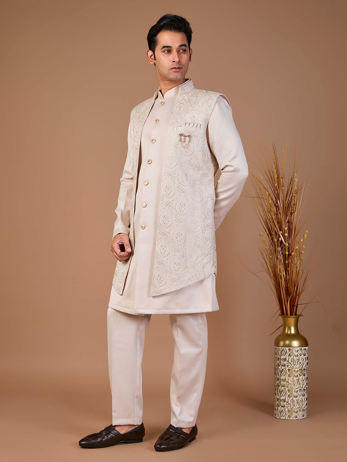 Beige Silk Jacket Style Embroidered Indowestern Set
