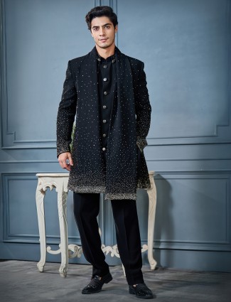 Black Long Open Indo Jacket Set With Dupatta
