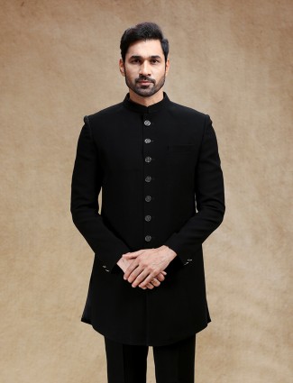Black Terry Rayon Indo Western Set With Swarovski Work