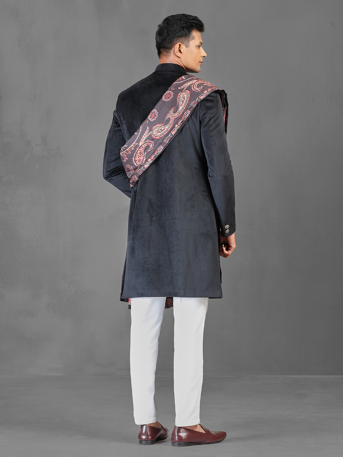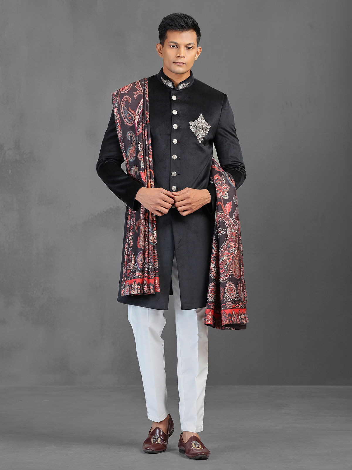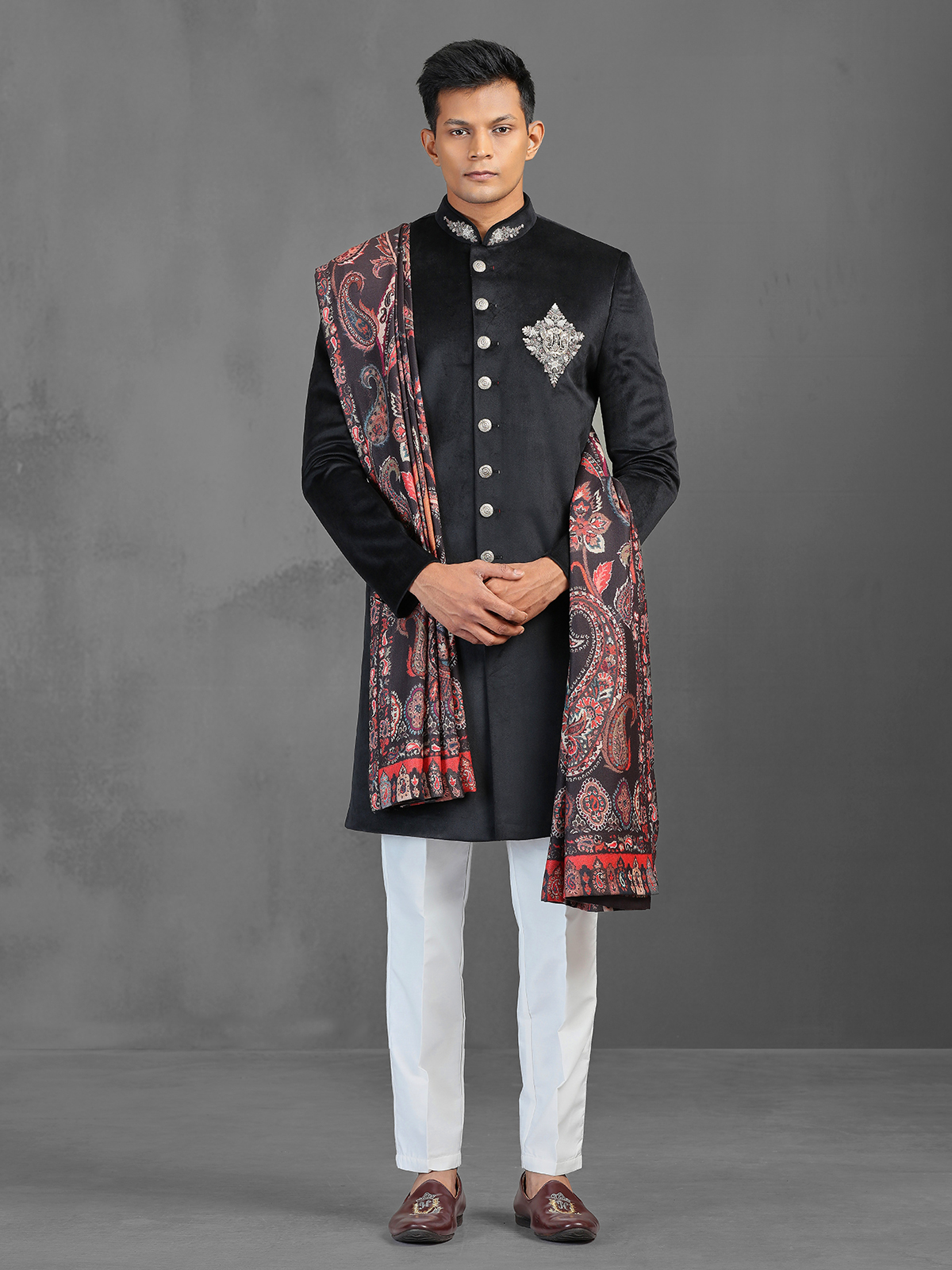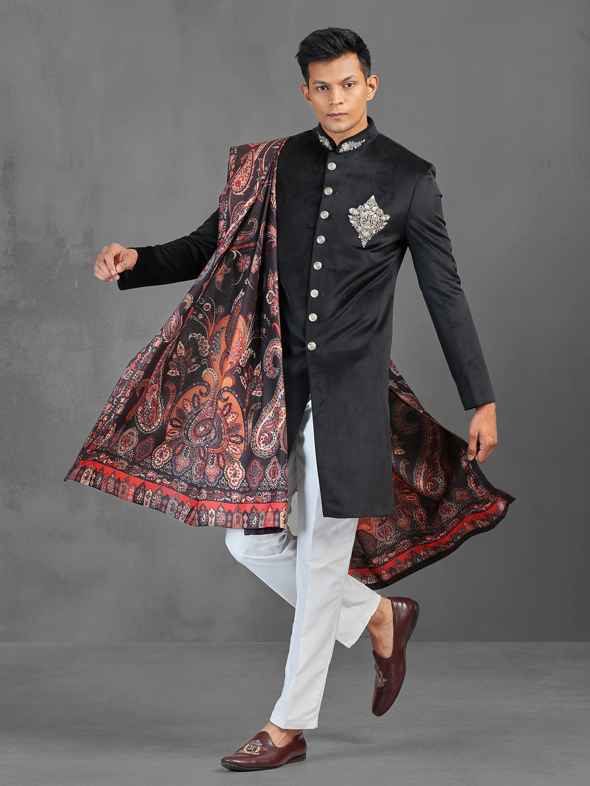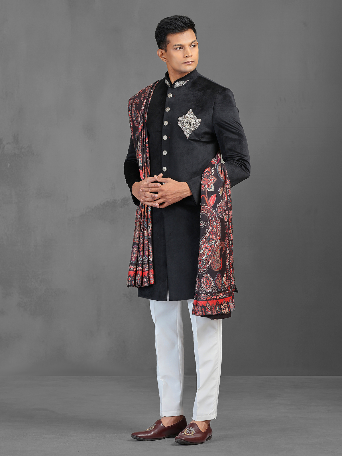 This black Indo-western suit reflects regal and authoritative charm through its striking high-contrast palette. The structured black jacket features a sharp mandarin collar enhanced with sequins and cutdana detailing, and is complemented by a statement diamond-shaped brooch on the chest with matching ornament embellishment. A rich paisley-patterned shawl in deep red and charcoal is draped over the shoulder, adding texture and visual depth. Paired with crisp white trousers, this look defines formal elegance, ideal for receptions or gala events.