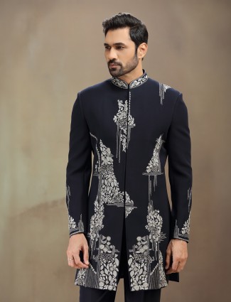 Deep blue terry rayon forms the base of this Indo-western with striking charm. Embroidery, beads, and cutdana sparkle like drops of dew scattered upon the ocean. Enhanced with an unstitched bottom, it promises personalized finesse, making it a versatile and regal pick for grand occasions.