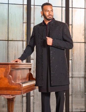 Classic Black Art Silk Cutdana Work Indo Western Jacket