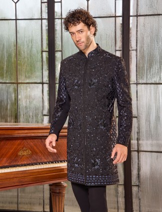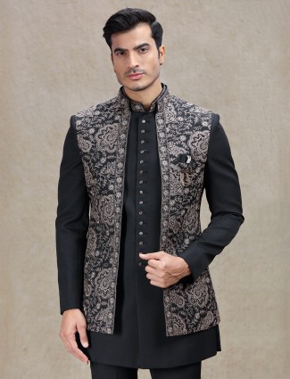 Classic Black Art Silk Indo Western Suit For Men