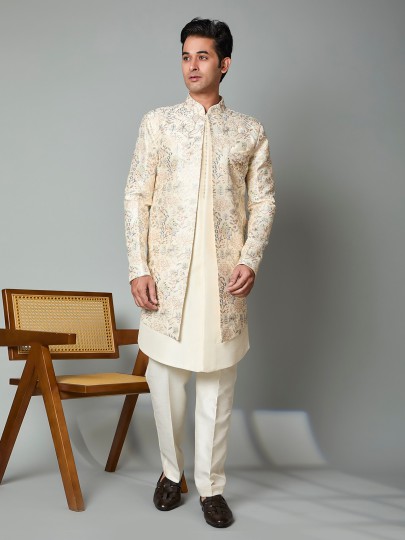 Tailored in classic cream silk, this Indowestern set showcases intricate embroidery highlighted with subtle sequins. Finished with a tasteful brooch and structured pant, it delivers timeless elegance ideal for weddings and refined reception occasions.