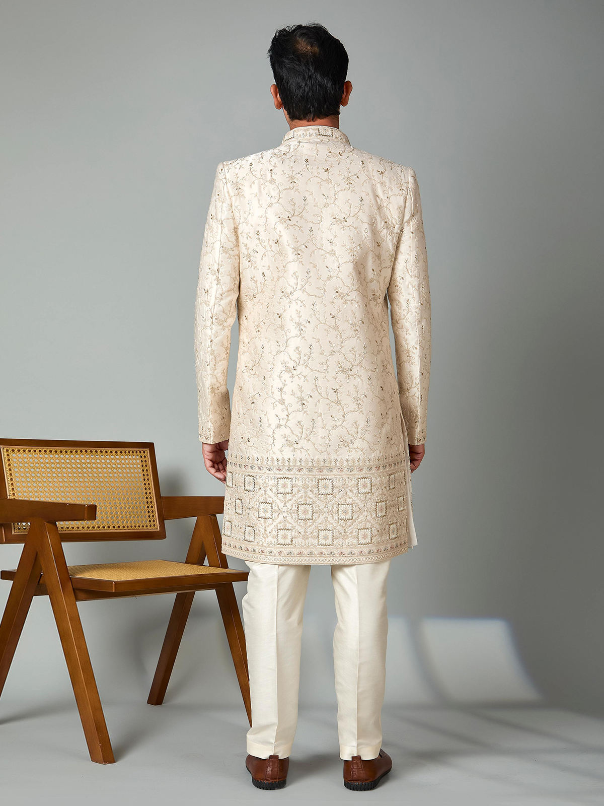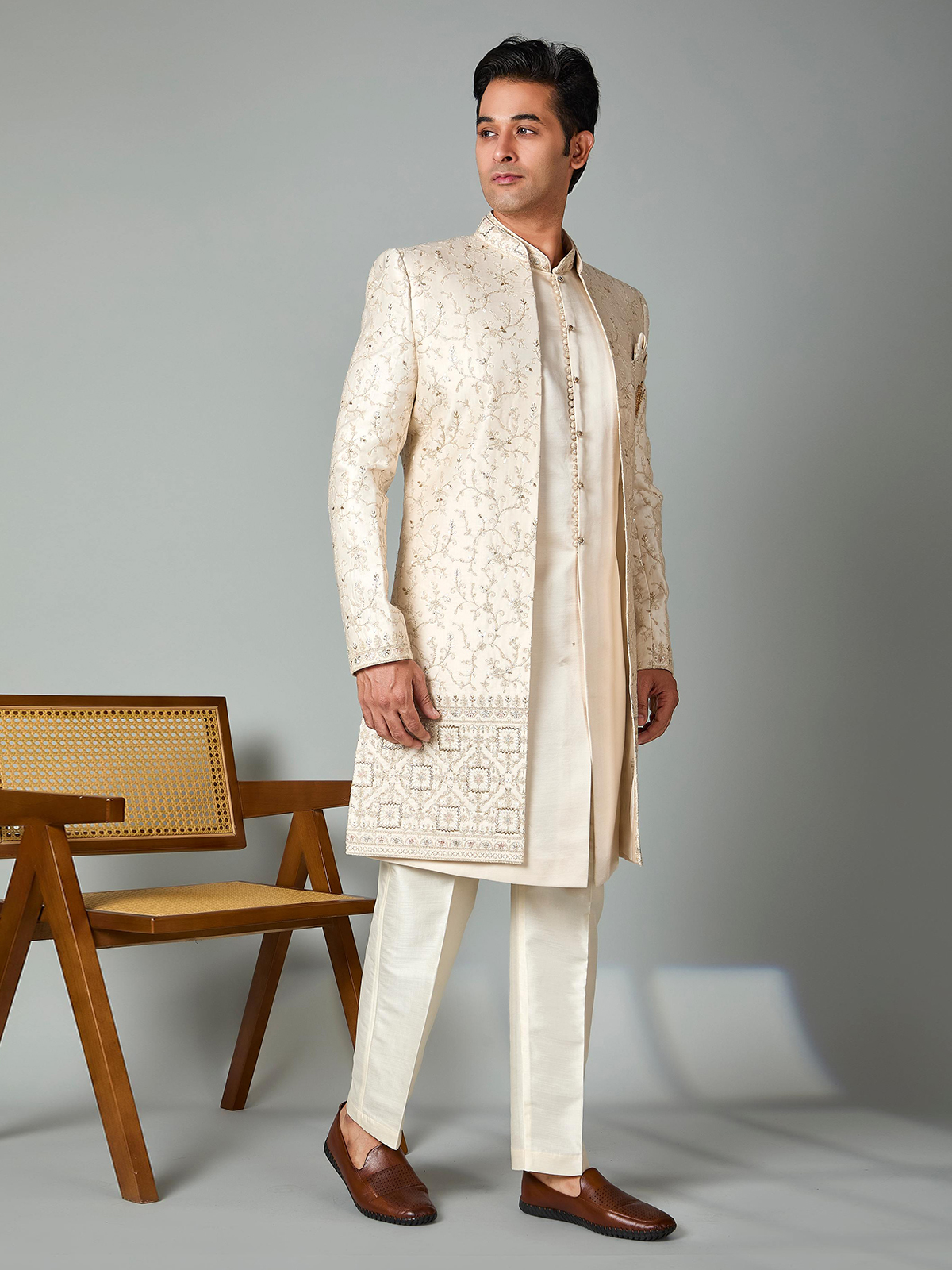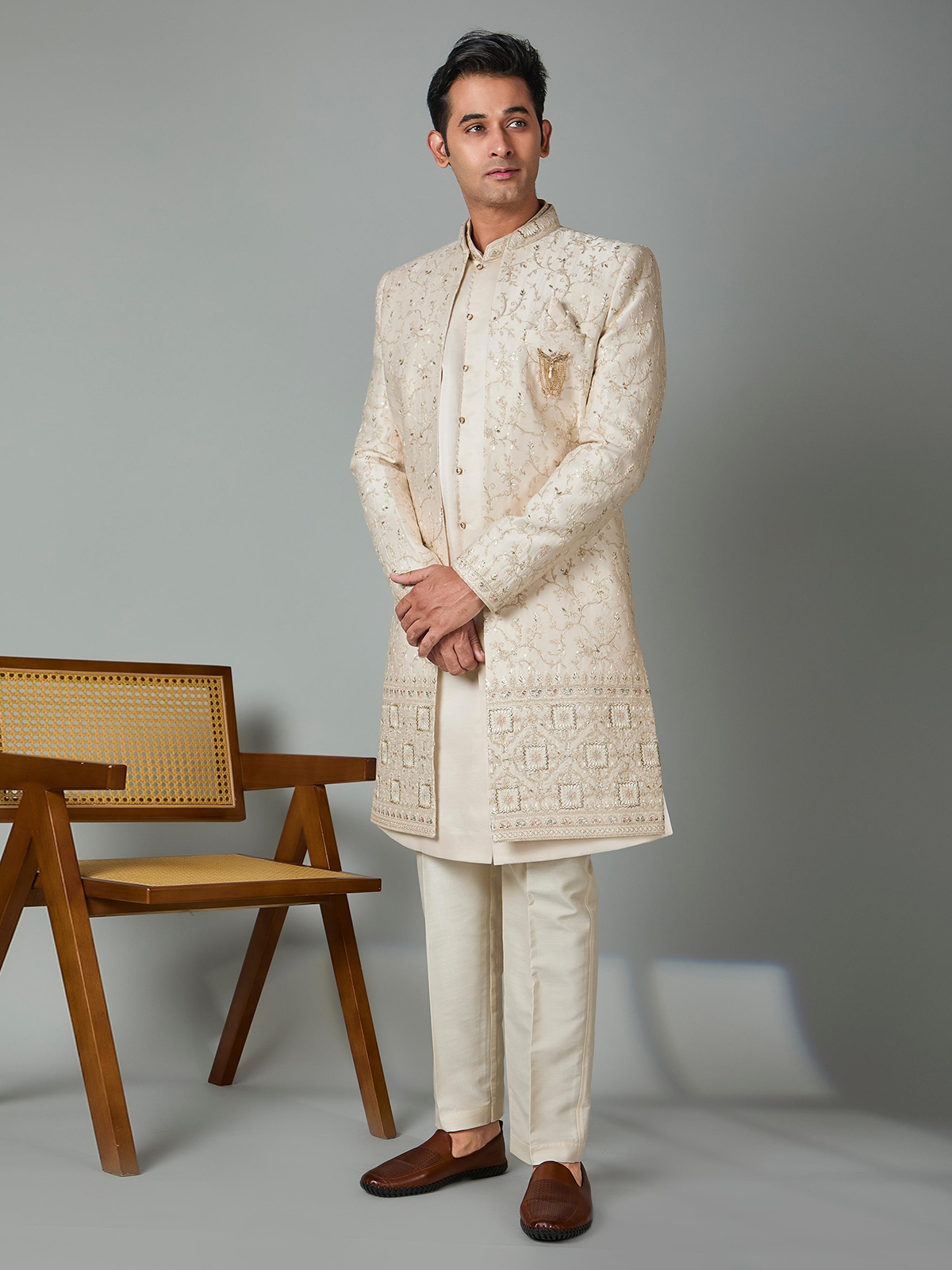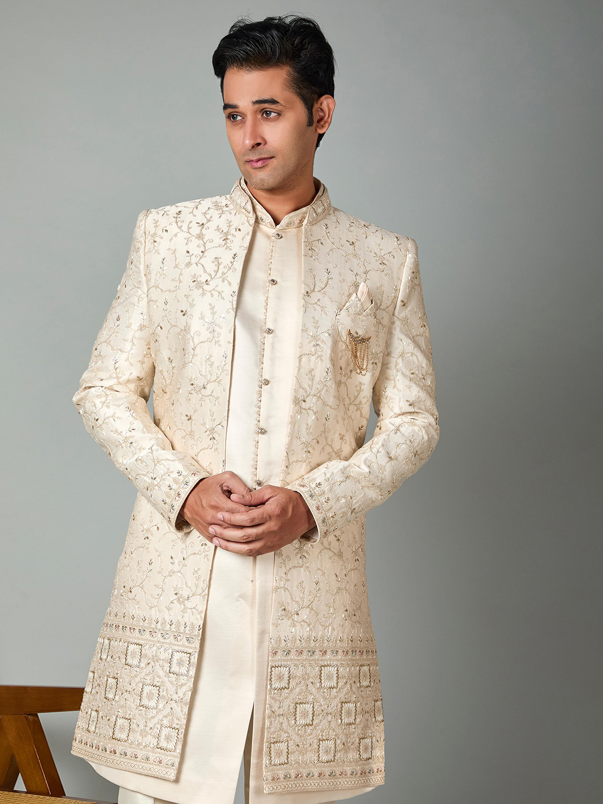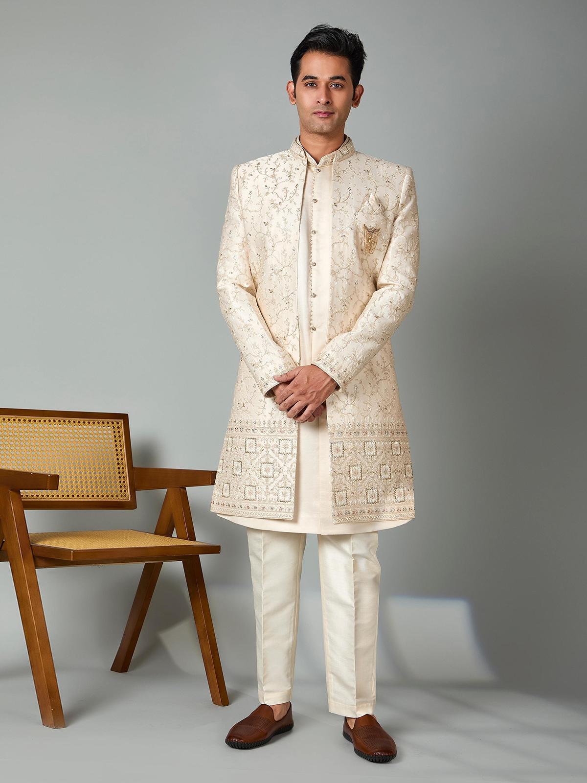 Blending traditional craftsmanship with modern refinement, this cream silk Indowestern set is adorned with elegant embroidery and sequins. Finished with a classic brooch and tailored pant, it offers timeless sophistication for wedding ceremonies and reception evenings.