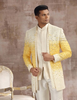 In rich green art silk, this indo western with jacket showcases elegant embroidery. Its designer finish and classic tailoring ensure a royal look, while pants complete the ensemble. Perfect for weddings and receptions, it reflects timeless charm with refined artistry.