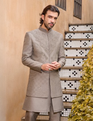 In classic grey art silk, this indo western jacket features exquisite cutdana and bead work. Paired with pants, it captures understated royal charm and dignified elegance, making it a refined choice for wedding and reception evenings with timeless allure.