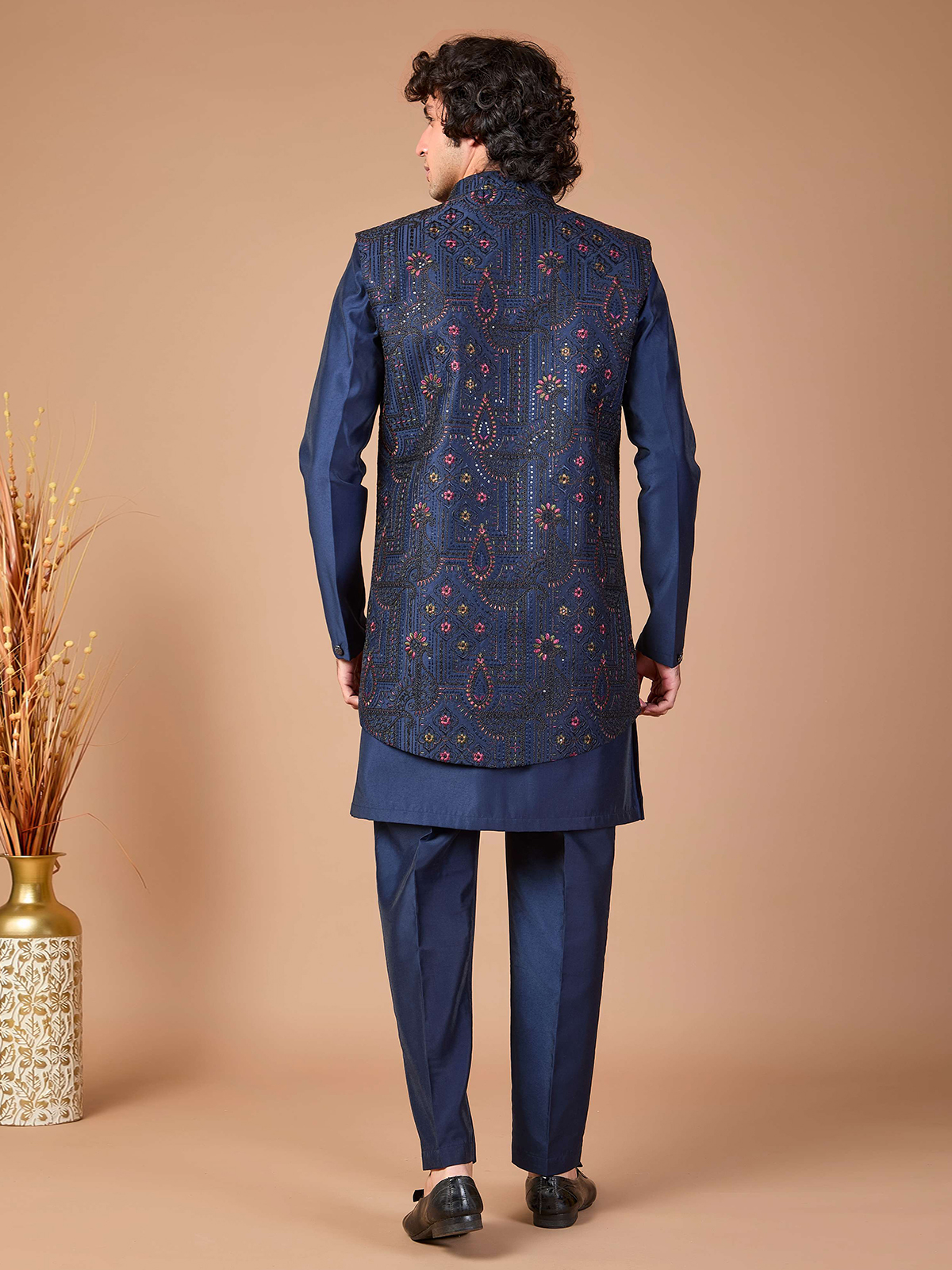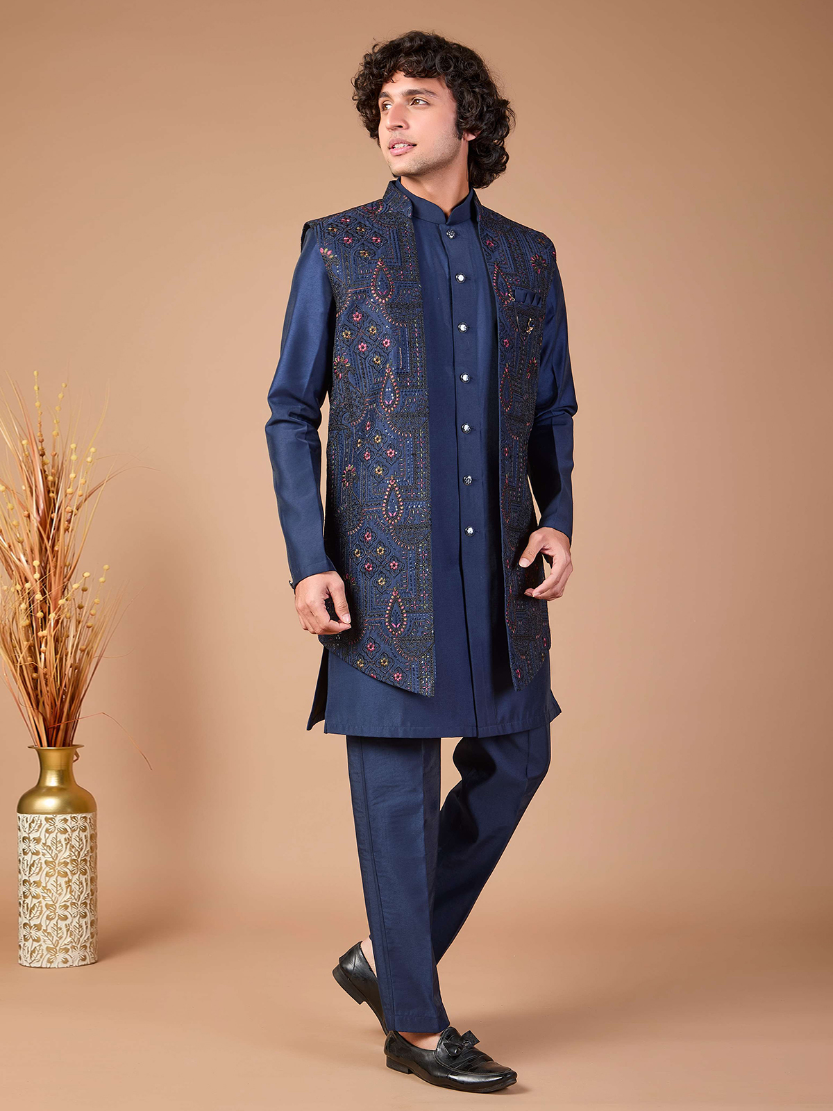 This navy silk Indowestern set blends traditional artistry with modern structure. Featuring an embroidered jacket highlighted with sequins and finished with a refined brooch and pant, it makes a bold yet elegant choice for wedding ceremonies and formal receptions.