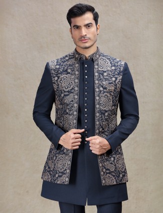 Navy Silk Jacket Style Embroidered Indowestern Set