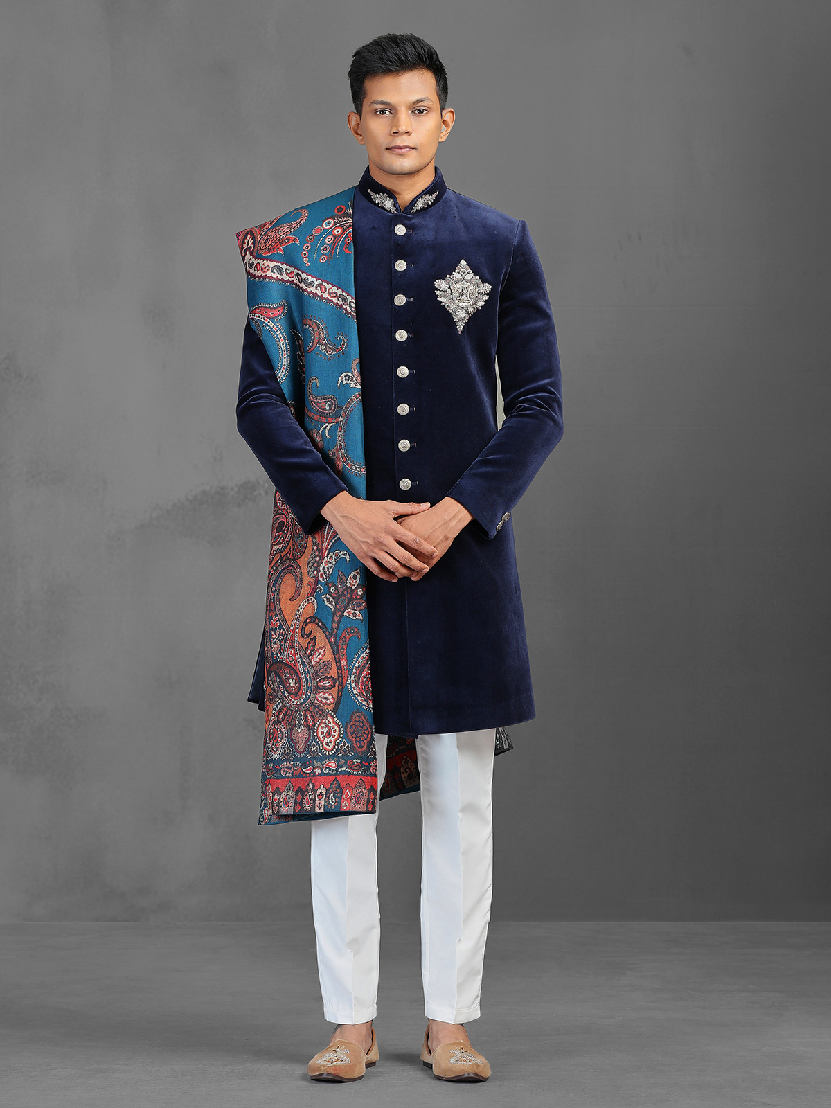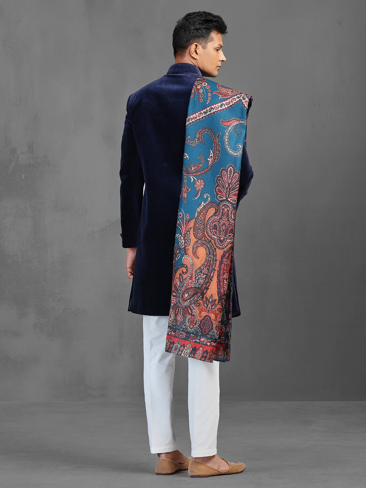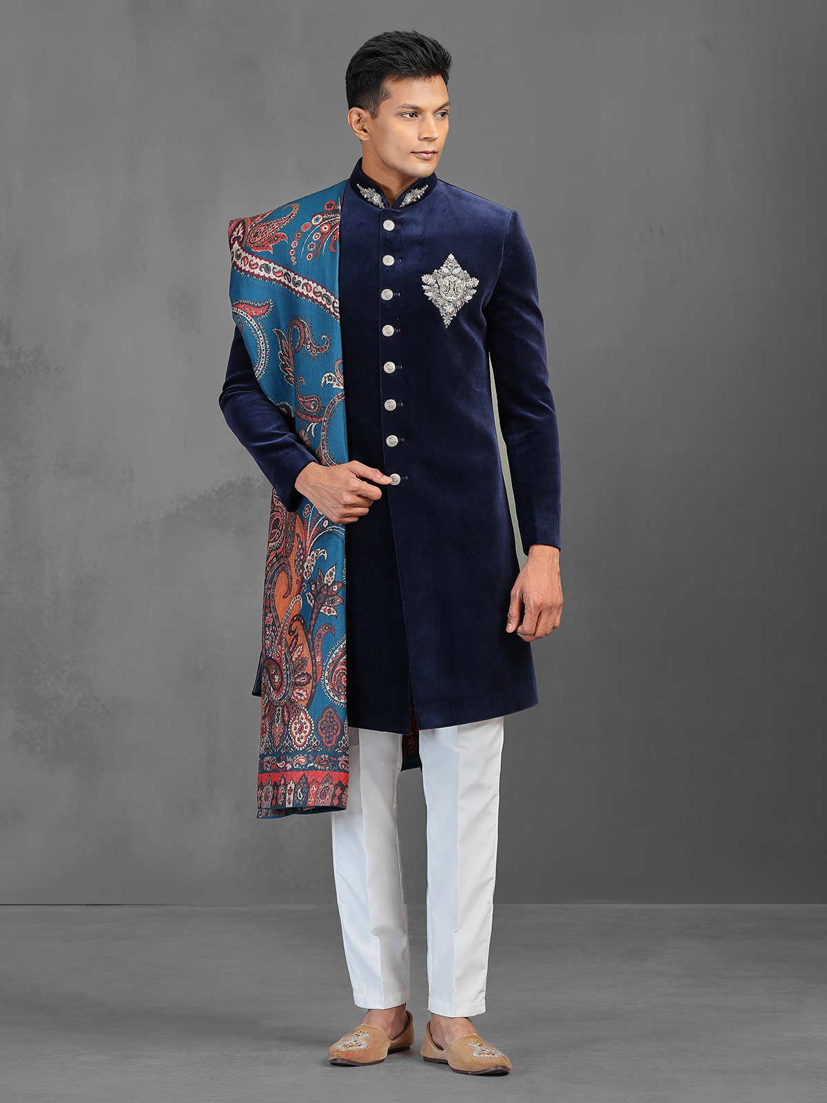This navy Indo-western suit showcases refined elegance with a contemporary and rich appeal. The structured navy jacket features a sharp mandarin collar adorned with intricate sequins and cutdana detailing, highlighted by a statement diamond-shaped brooch on the chest with coordinated embellishments. A luxurious paisley-patterned shawl in stone blue drapes gracefully over the shoulder, adding dimension and texture. Styled with crisp white trousers, this ensemble is perfect for receptions and festive evenings.
