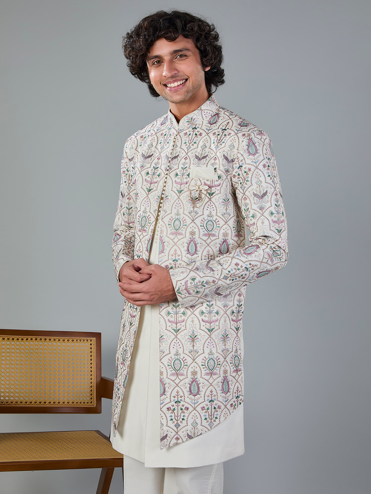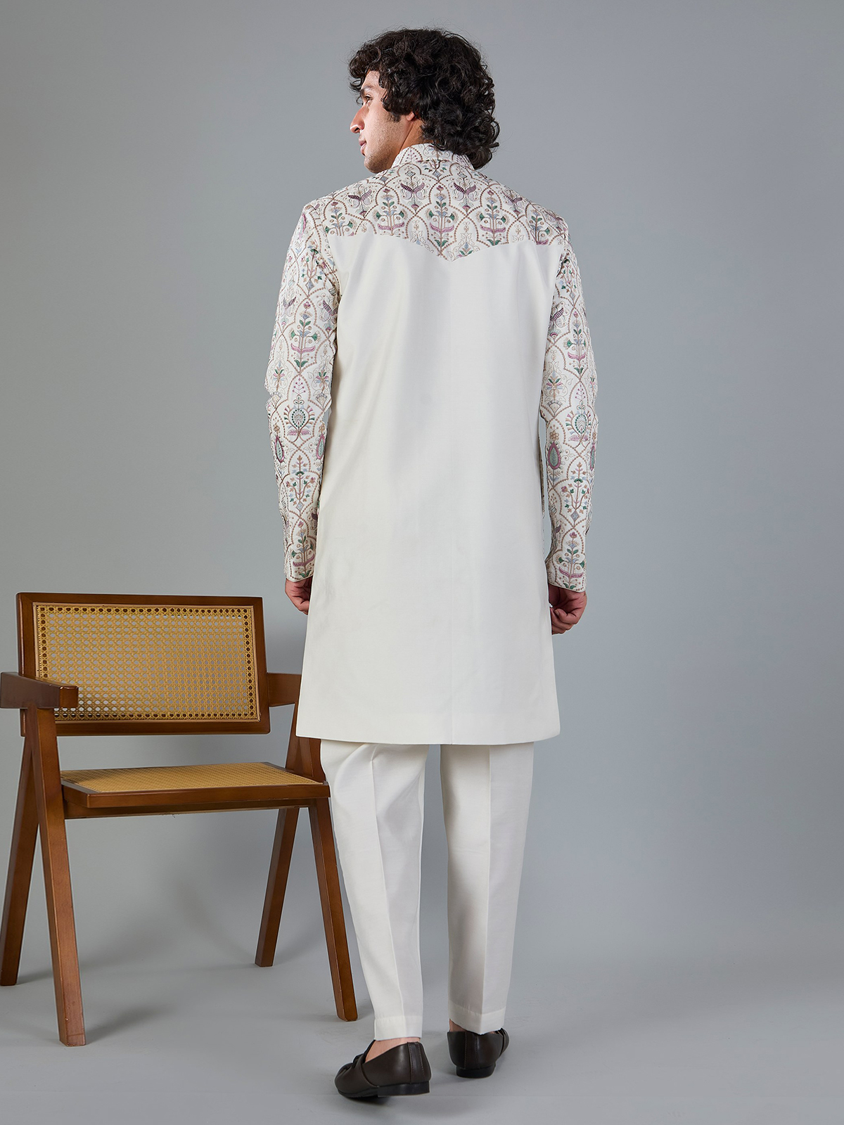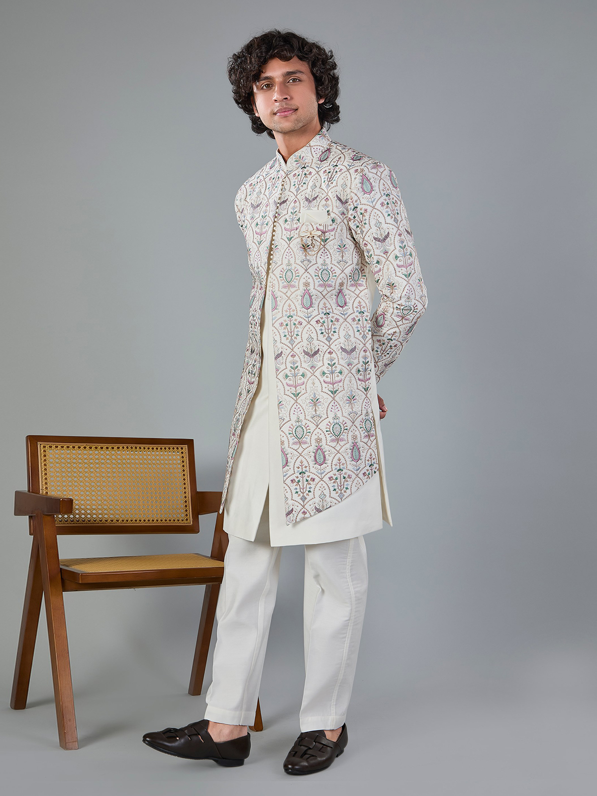 Off White Silk Jacket Style Embroidered Indowestern Set