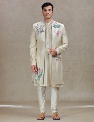 This elegant short jacket style Indo-Western in rich Rama Blue is a sophisticated choice for any wedding or reception. Featuring delicate sequins and intricate embroidery, it embodies both luxury and style. The luxurious silk fabric ensures comfort, while the detailed embellishments on the neck and yog add to its charm. A perfect blend of tradition and modernity, this ensemble comes with a bottom for a complete look.