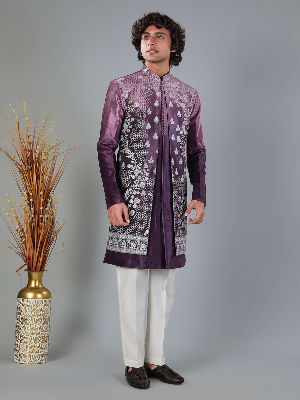 Designed in soft pastel purple shaded silk, this Indowestern set is enhanced with thread embroidery and subtle sequin highlights. Paired with a tailored pant, it offers a refined festive appeal perfect for weddings and elegant reception occasions.