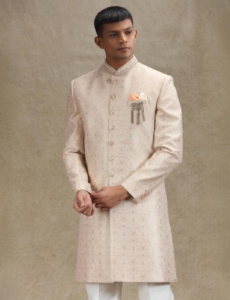 Elevate your festive ensemble with this peach jacquard Indo-Western featuring rich texture and adorned with exquisite beads, cutdana, and fine thread and pearl detailing. Combining contemporary charm with classic artistry, this set ensures a luxurious yet comfortable fit. Pair it with matching bottoms for a polished and stylish look at your celebration.
