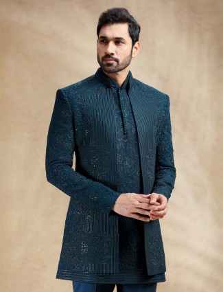 Teal Blue Silk Indo Western Set With Rich Embroidery