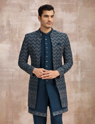 Teal Blue Silk Indowestern Set For Men’s Wedding Look