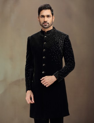 This white silk Indo-western for men features heavy elephant artwork crafted through zardosi, cutdana, beads, and stone detailing. The intricate design elevates its regal character, complemented by matching pants for wedding, reception, and engagement celebrations.