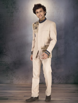 Tailored in pure jute, this beige Jodhpuri suit embodies subtle grace. Its printed surface and intricate thread work create a refined balance of tradition and artistry. Featuring a Chinese collar and full sleeves, it pairs with pant for weddings and reception evenings of timeless poise.