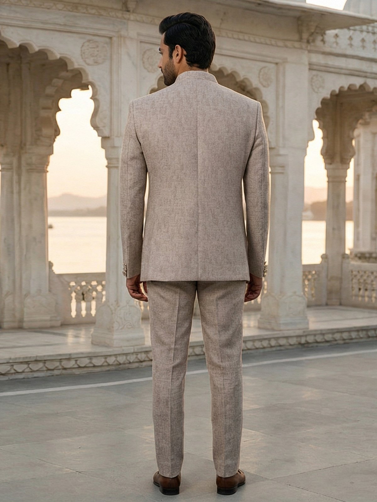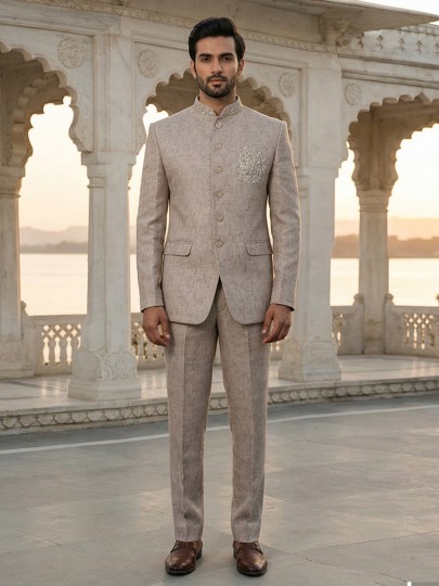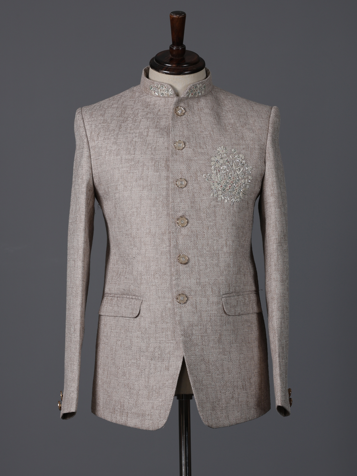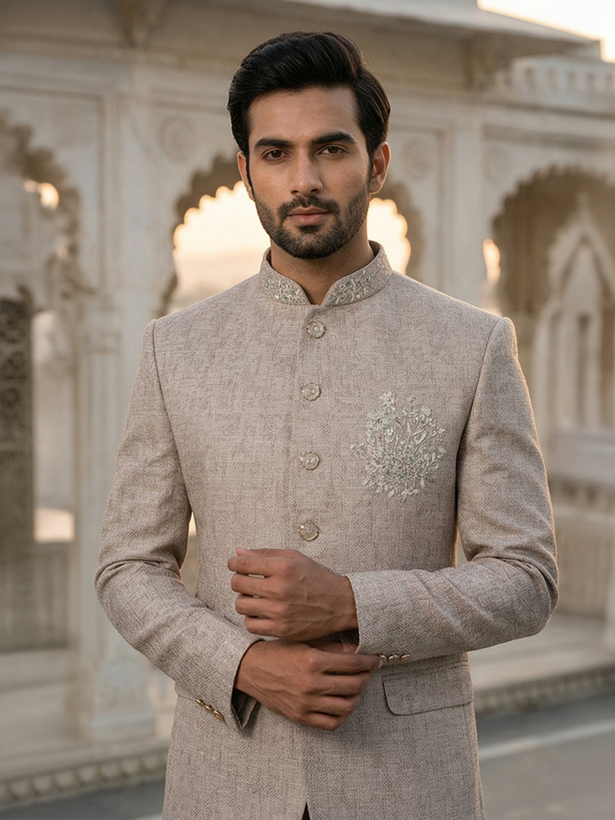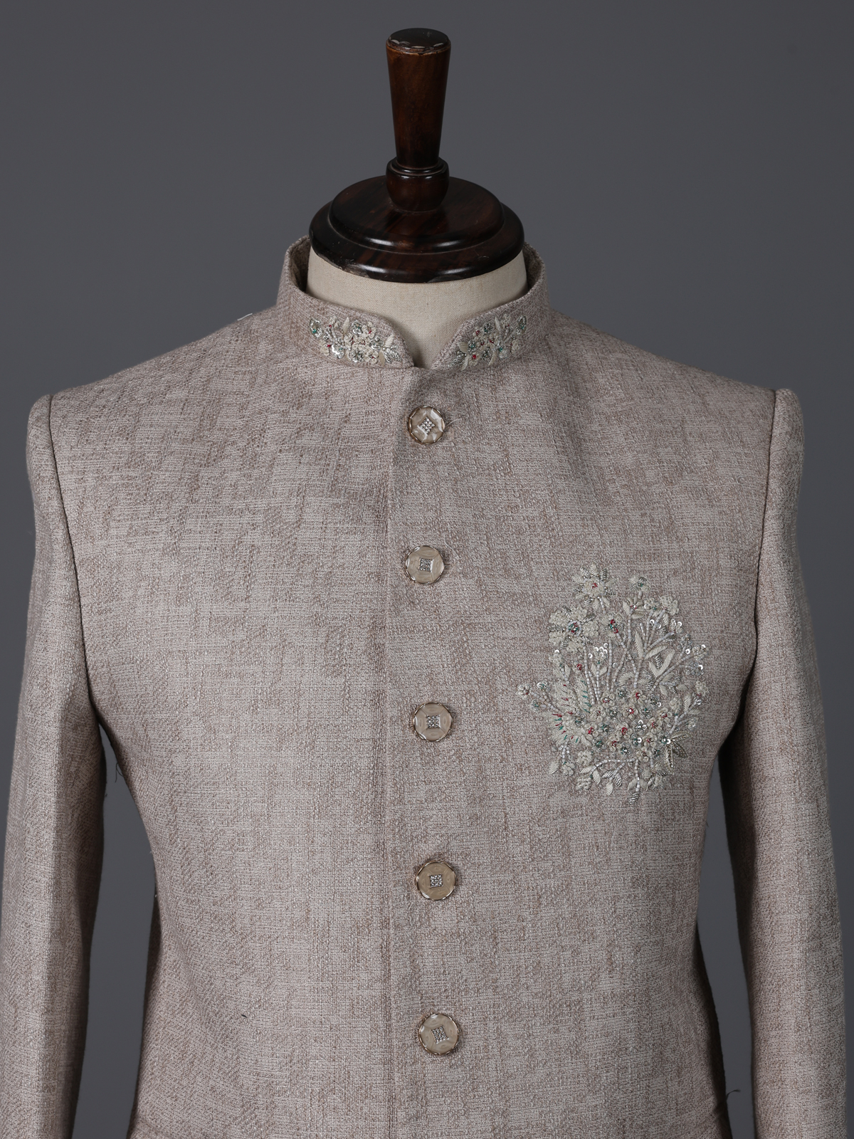 Khaki Jute Zardosi Designer Jodhpuri Suit