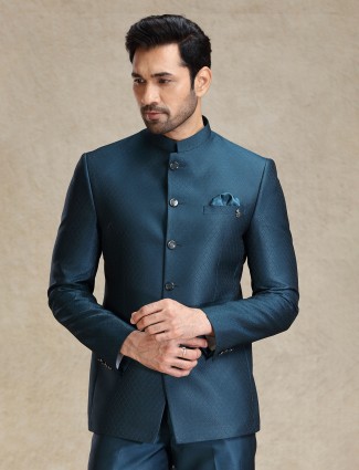 Offering a fresh take on classic style, the Peacock Blue Jodhpuri suit is tailored in textured terry rayon with subtle detailing. Its sophisticated look is completed by a mandarin collar and matching trousers, ideal for formal gatherings.
