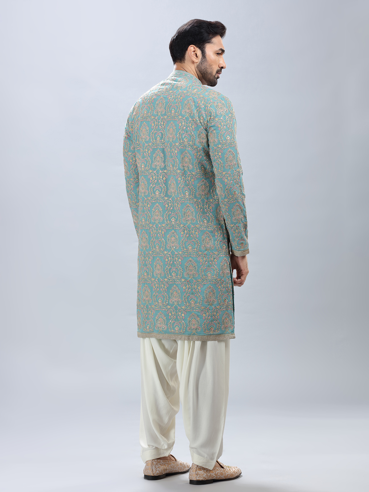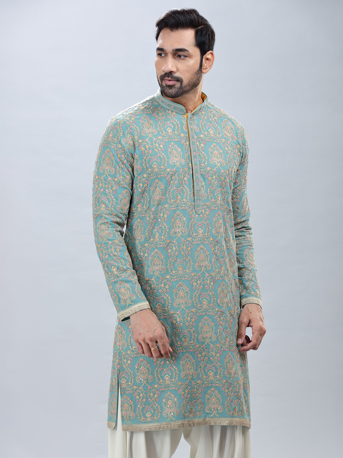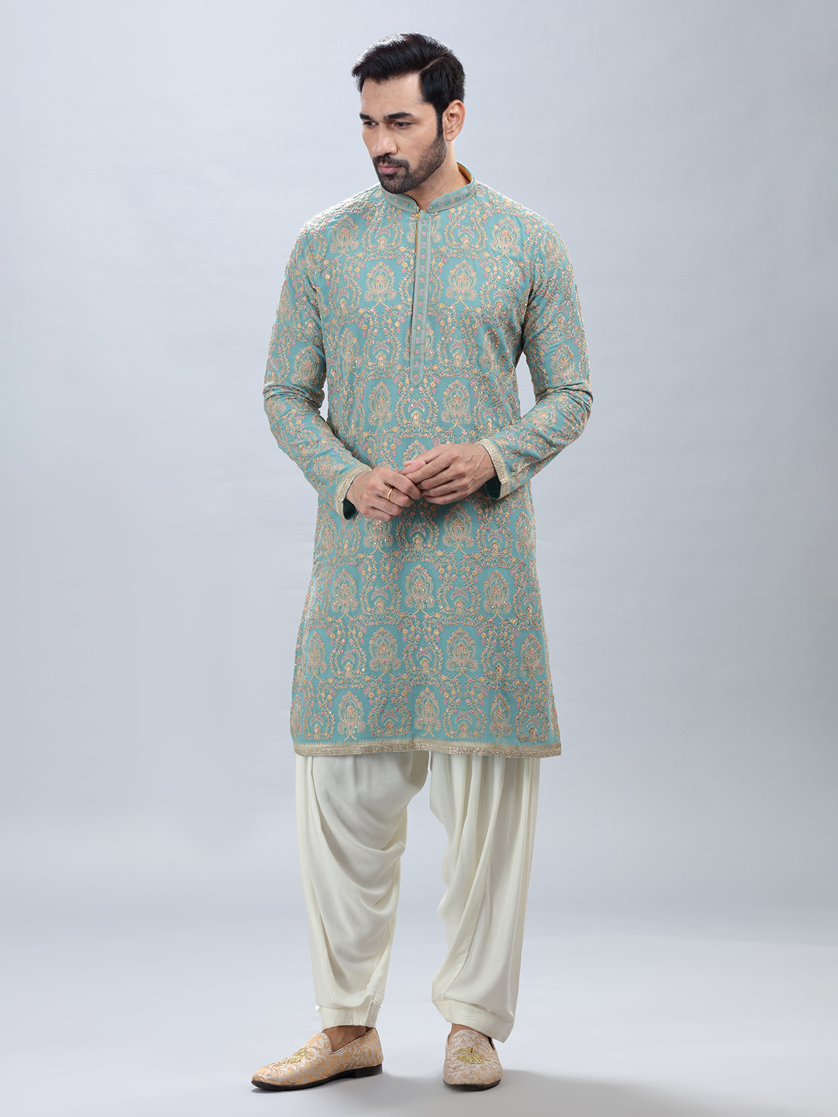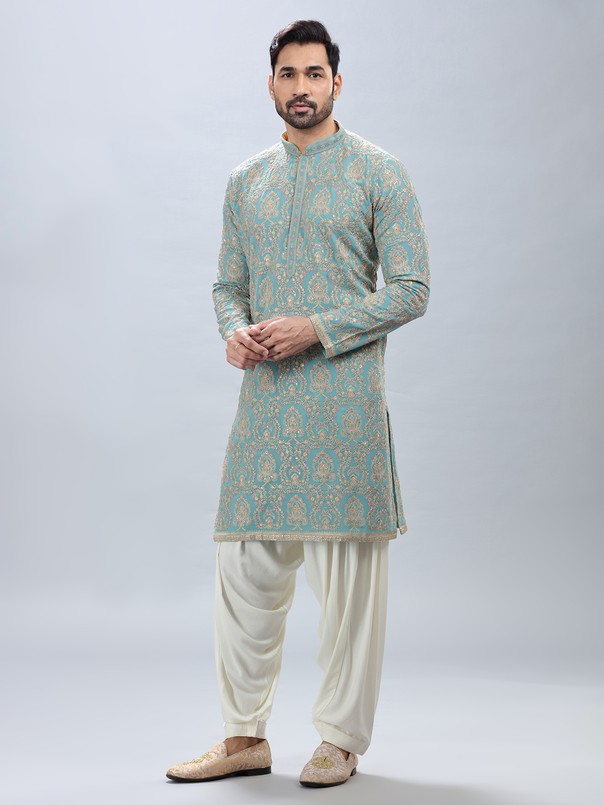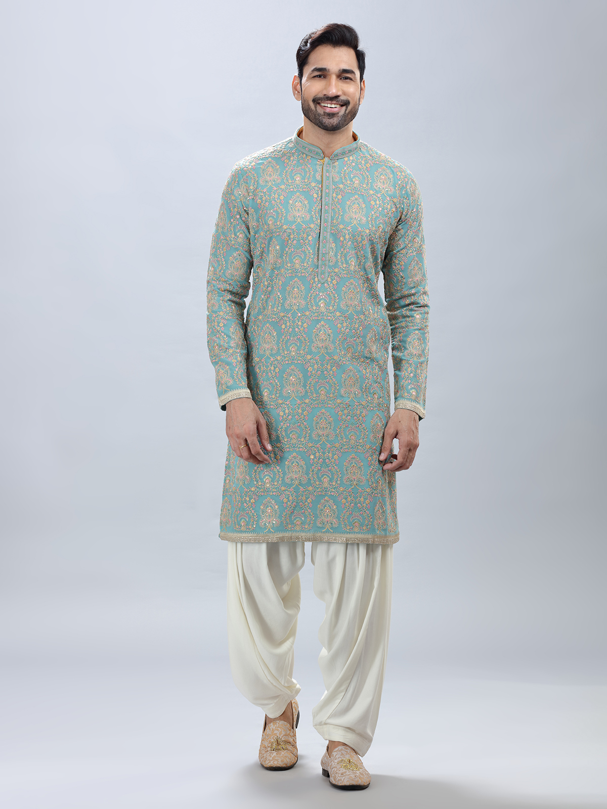 Nature-inspired stone, resham, and embroidered patterns enhance the plain yet exquisite aqua cotton silk fabric. This kuta suit's long sleeves and Mandarin collar are its main characteristics. For this one, a matching bottom is provided.