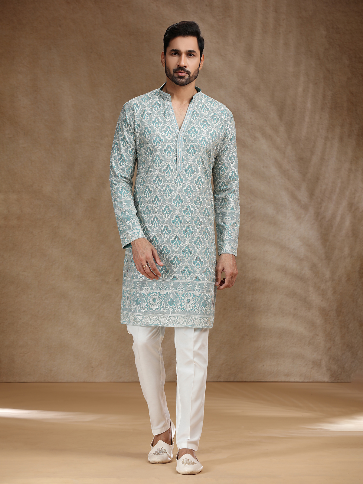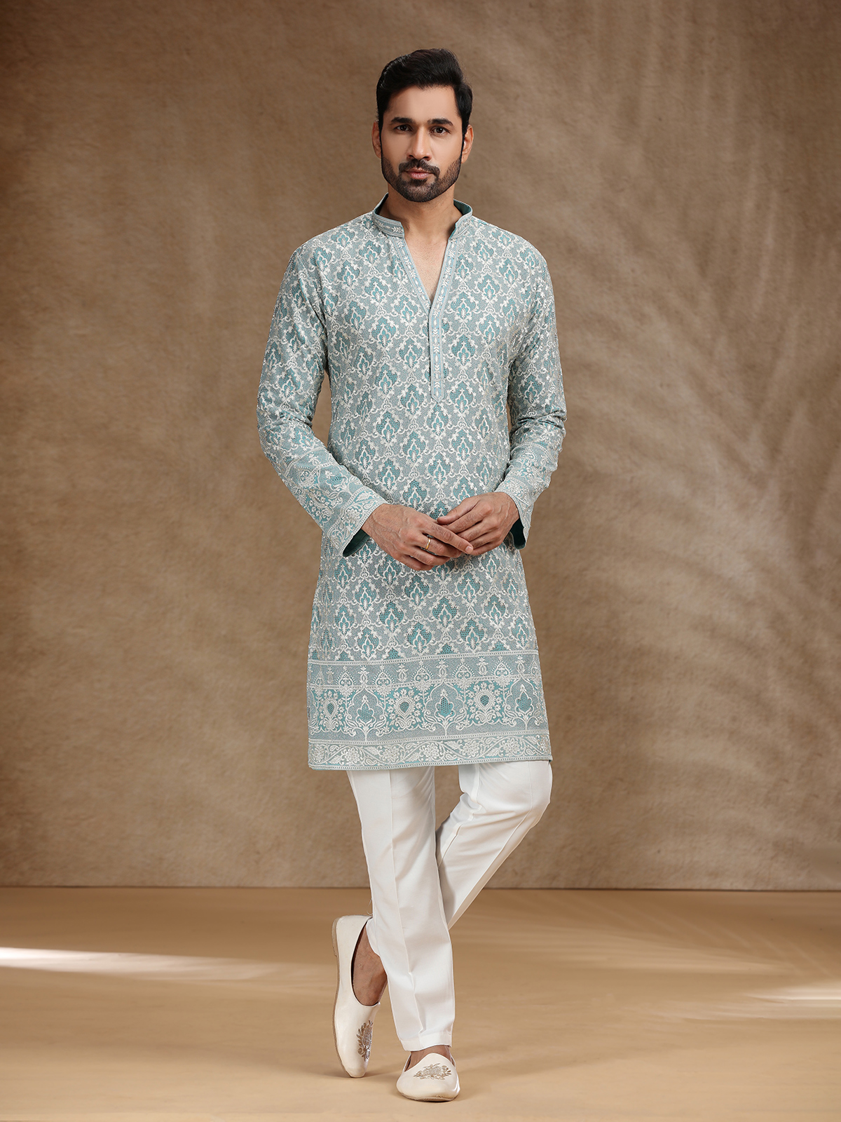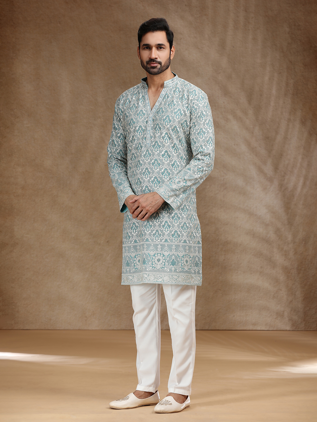 In radiant aqua georgette, this kurta suit comes alive with resham and Swarovski detailing that lend a dazzling festive sparkle. Designed with a stand collar and full sleeves, it flows gracefully with a soft salwar. The lively aqua hue captures freshness and joy, creating an ensemble that shines with refined beauty and timeless celebration.