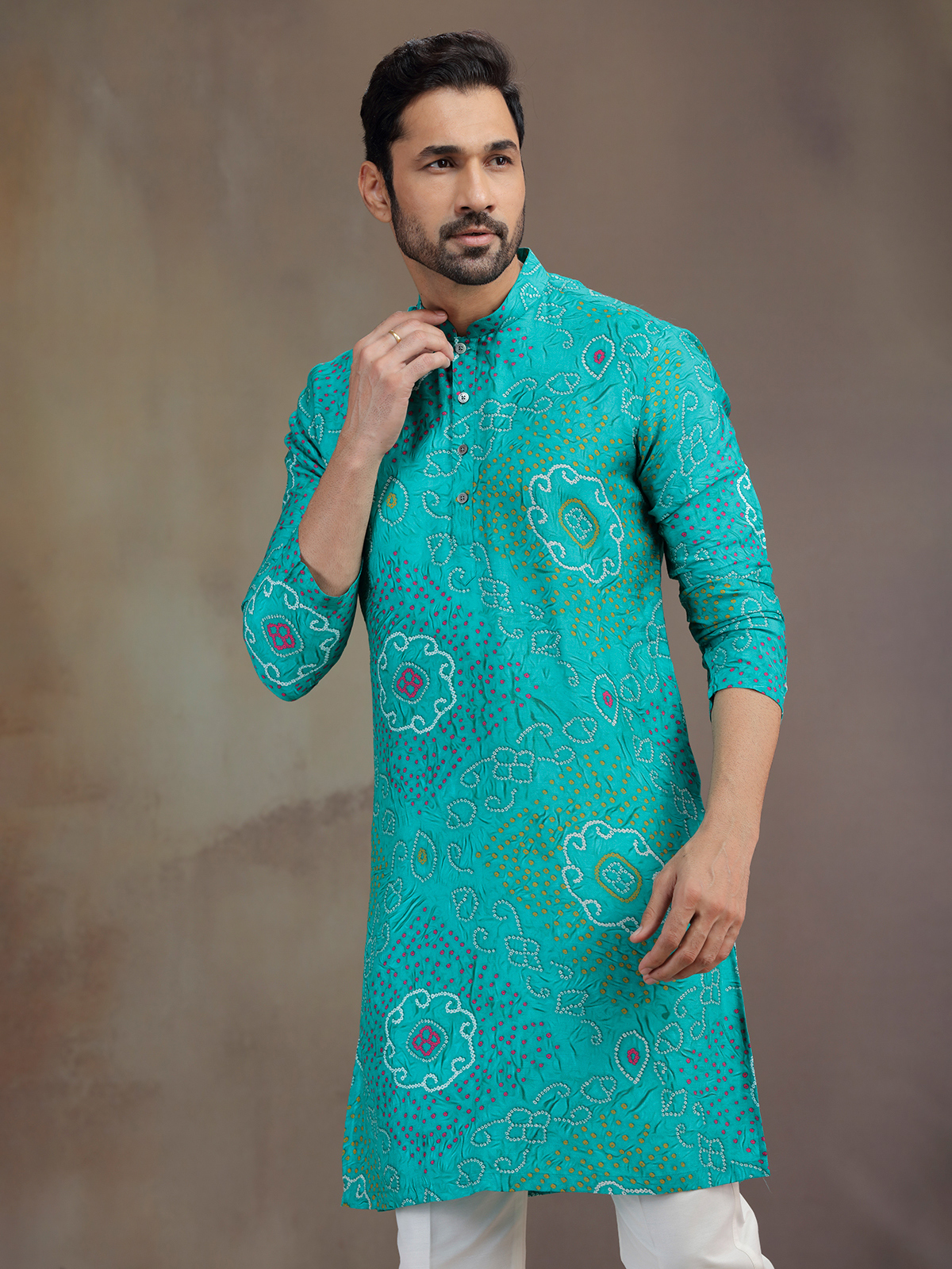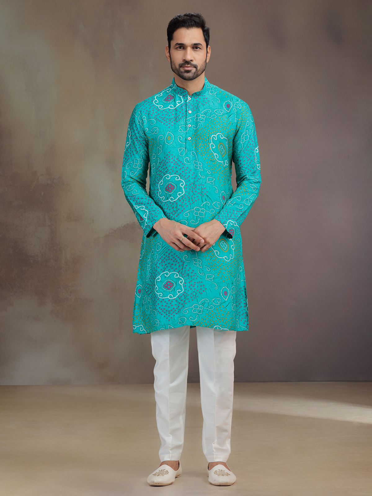 Aqua Printed Silk Kurta Pajama For Celebrations