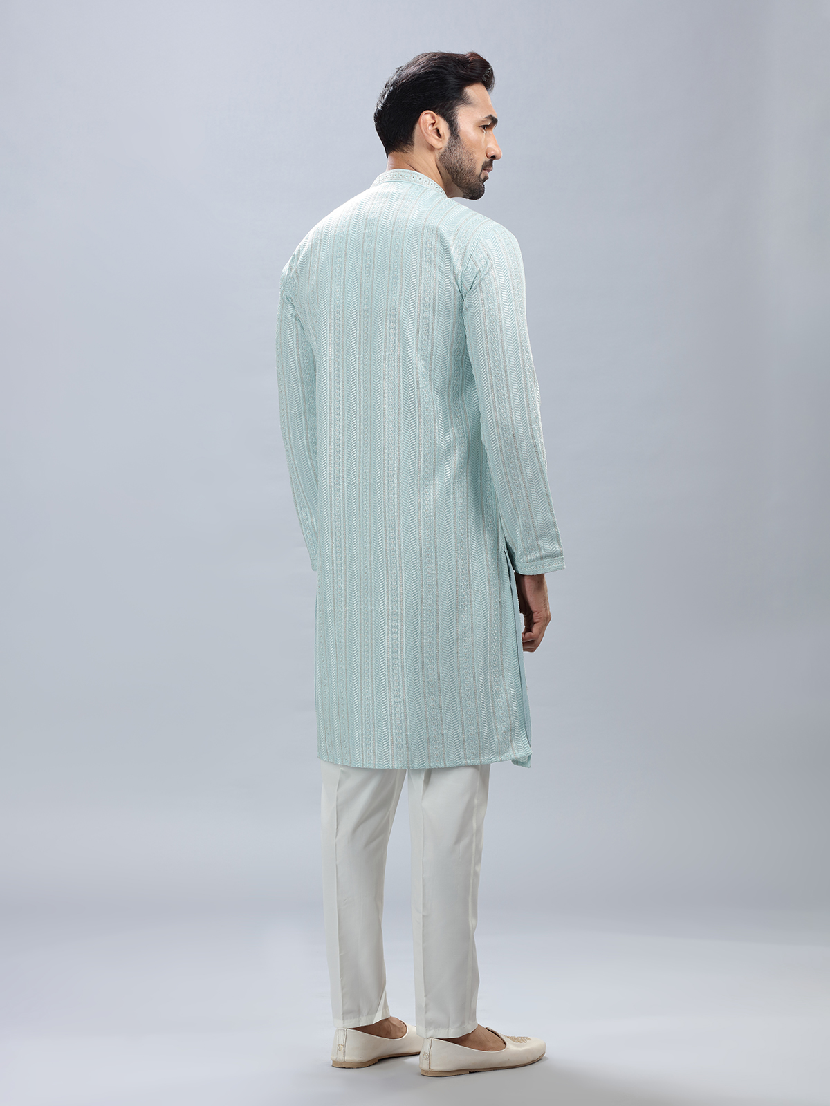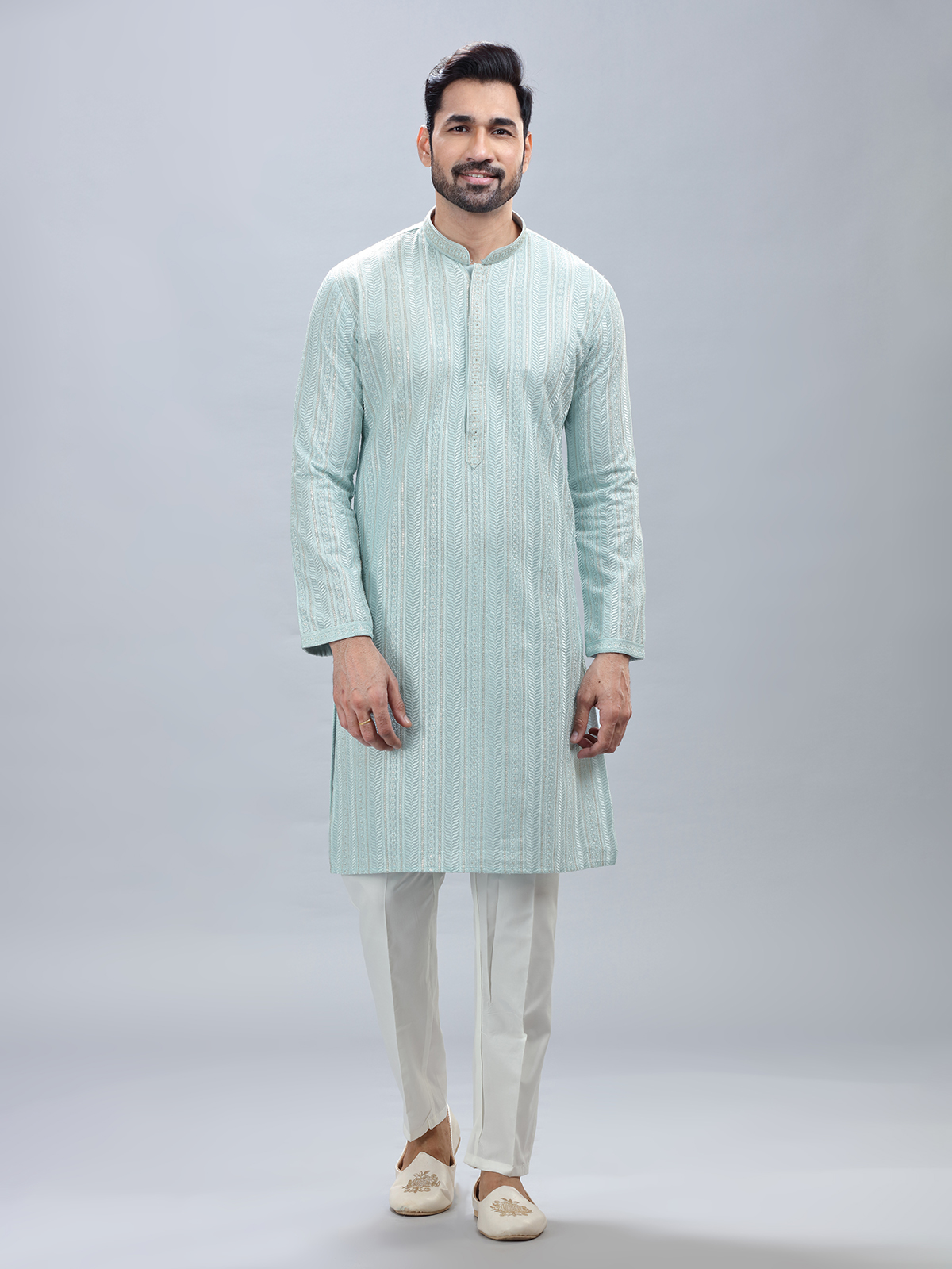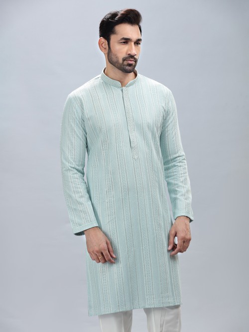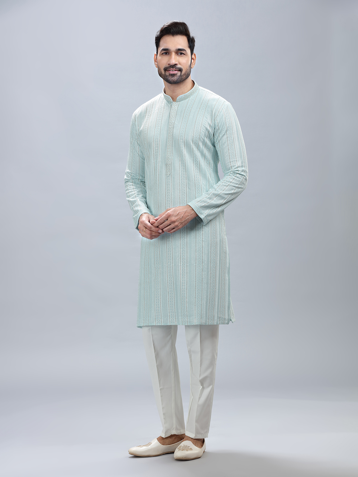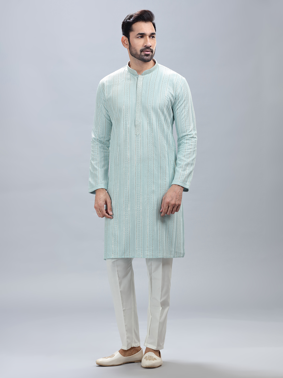 The piece's distinctive aqua hue and the georgette fabric's embroidery, resham, and sequins throughout make it exceptional. This one is comfortable for festive events because of its mandarin collar and full-sleeve design. comes with a matching bottom.
