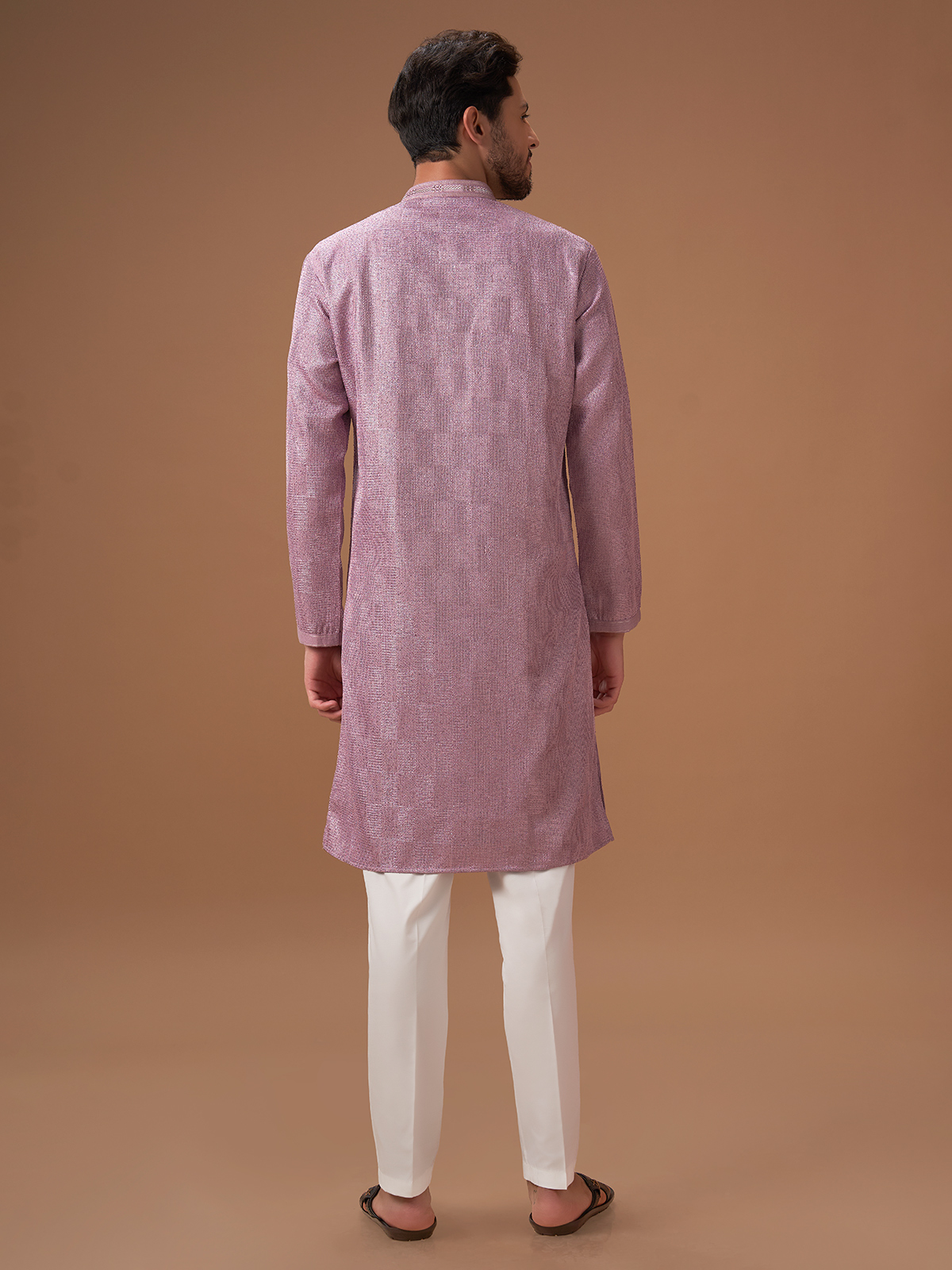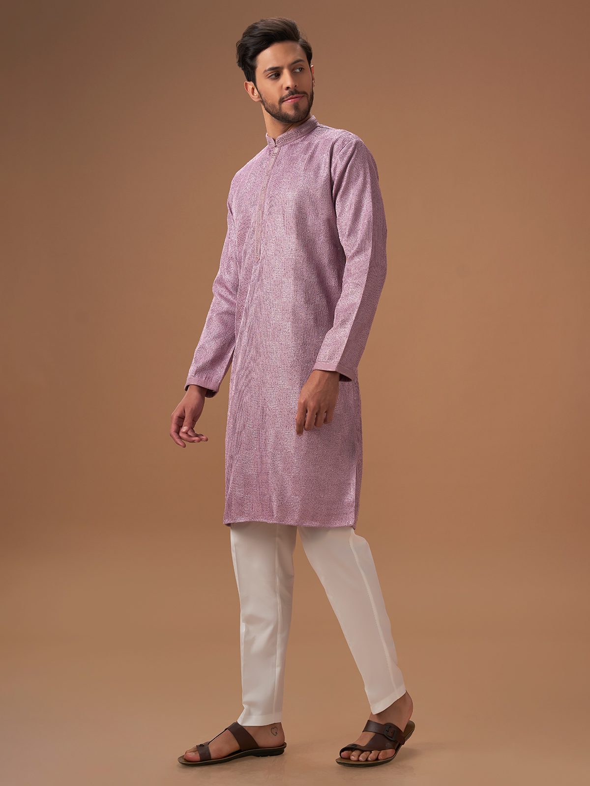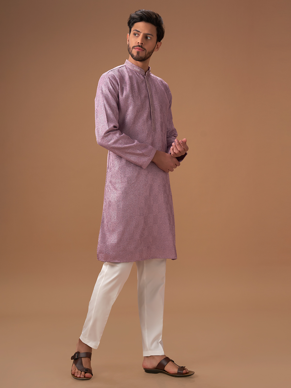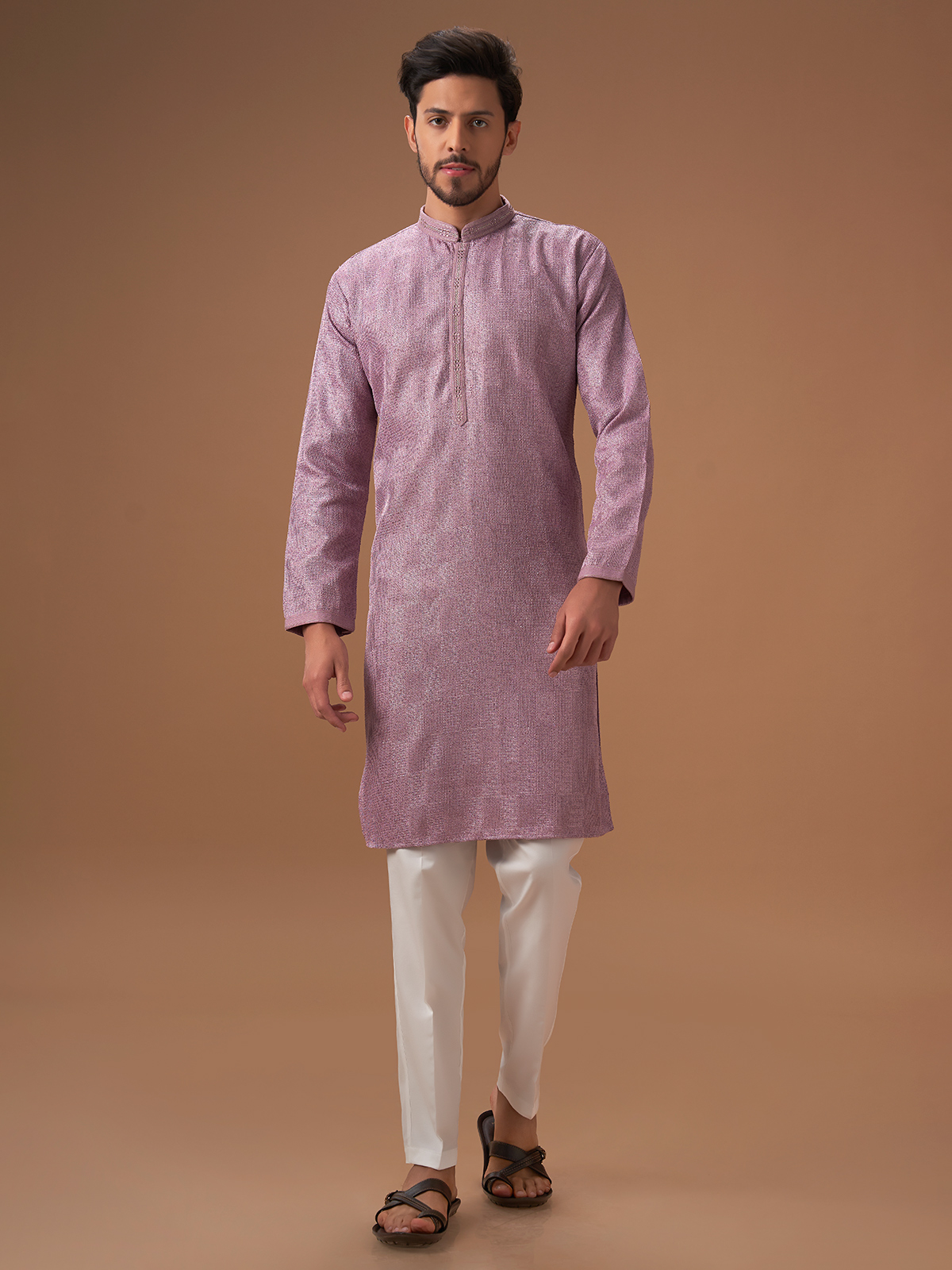Make a statement at the upcoming festive celebrations in this elegant mauve pink silk kurta suit. Adorned with resham and sequins work, it boasts a mandarin collar and full sleeves. The ensemble includes a bottom.