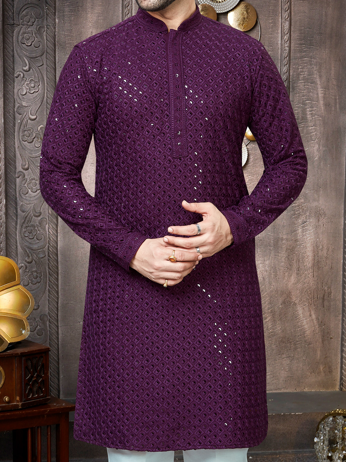 Attractive Purple Georgette Sequins Kurta Suit For Men