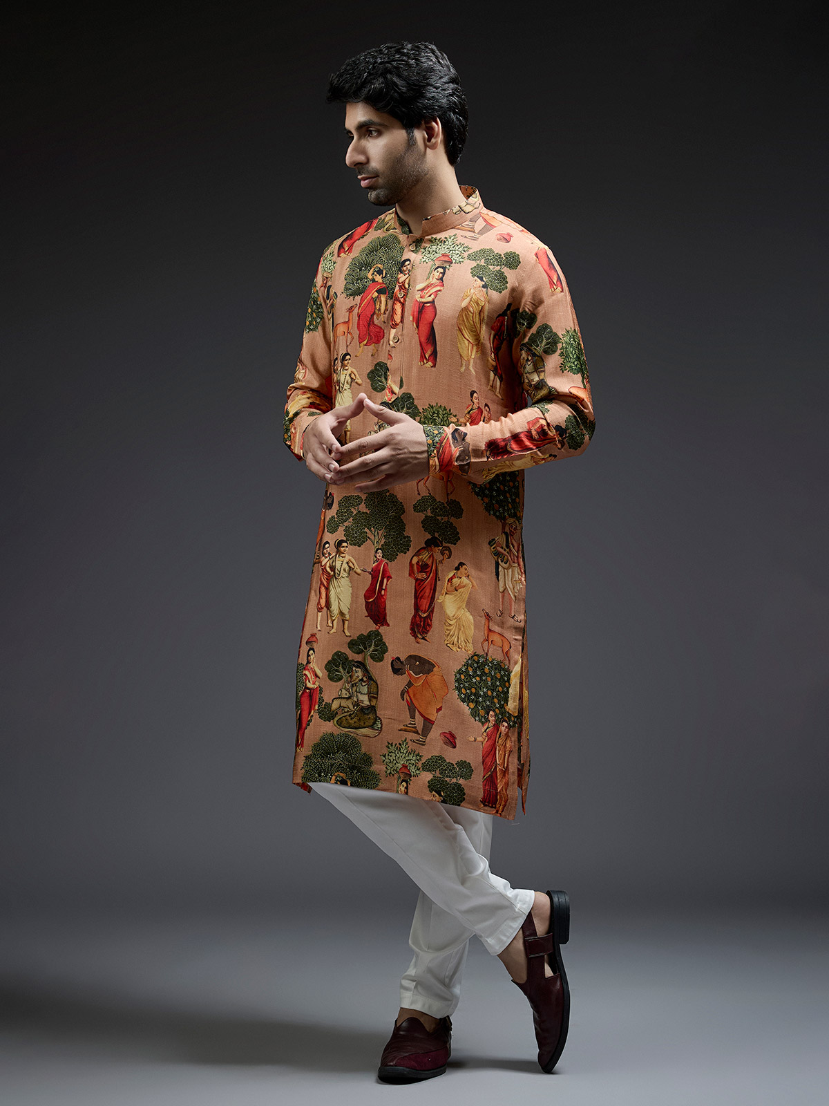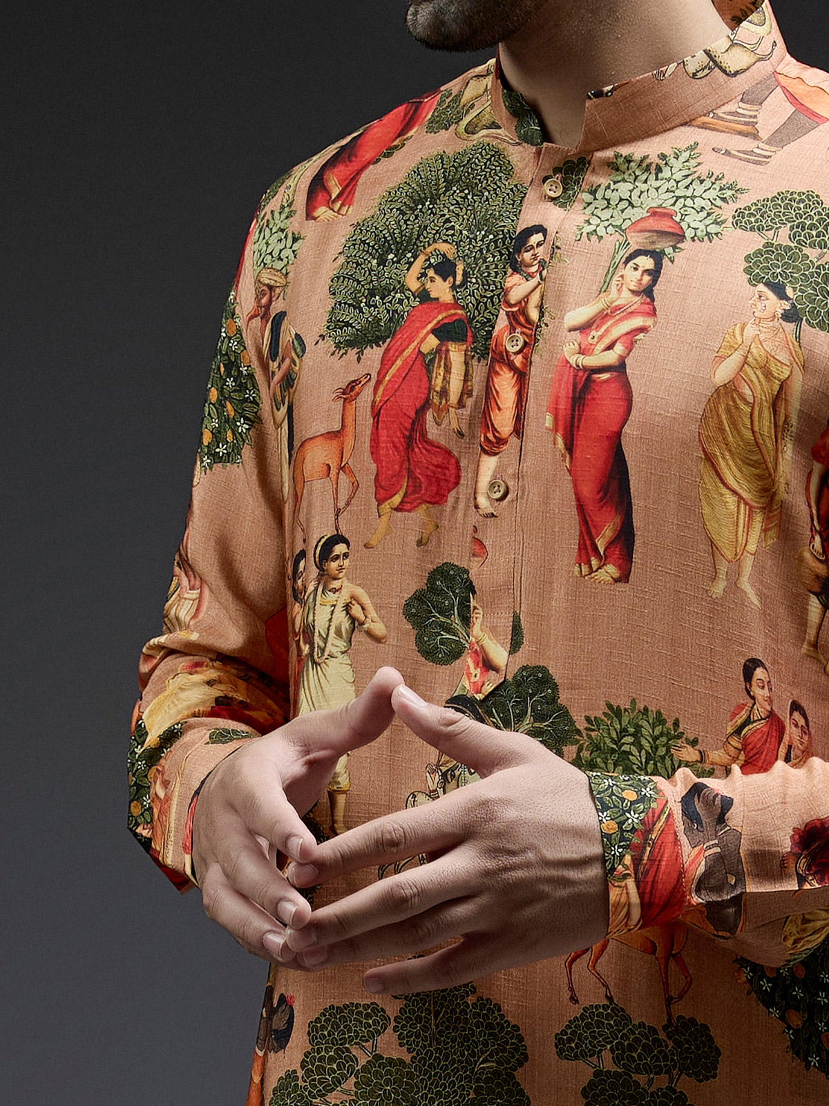 Awesome Silk Peach Village Theme Printed Kurta Suit
