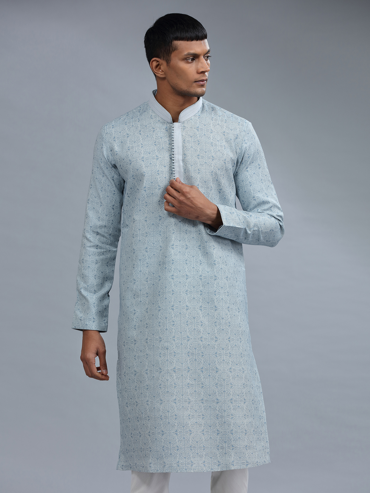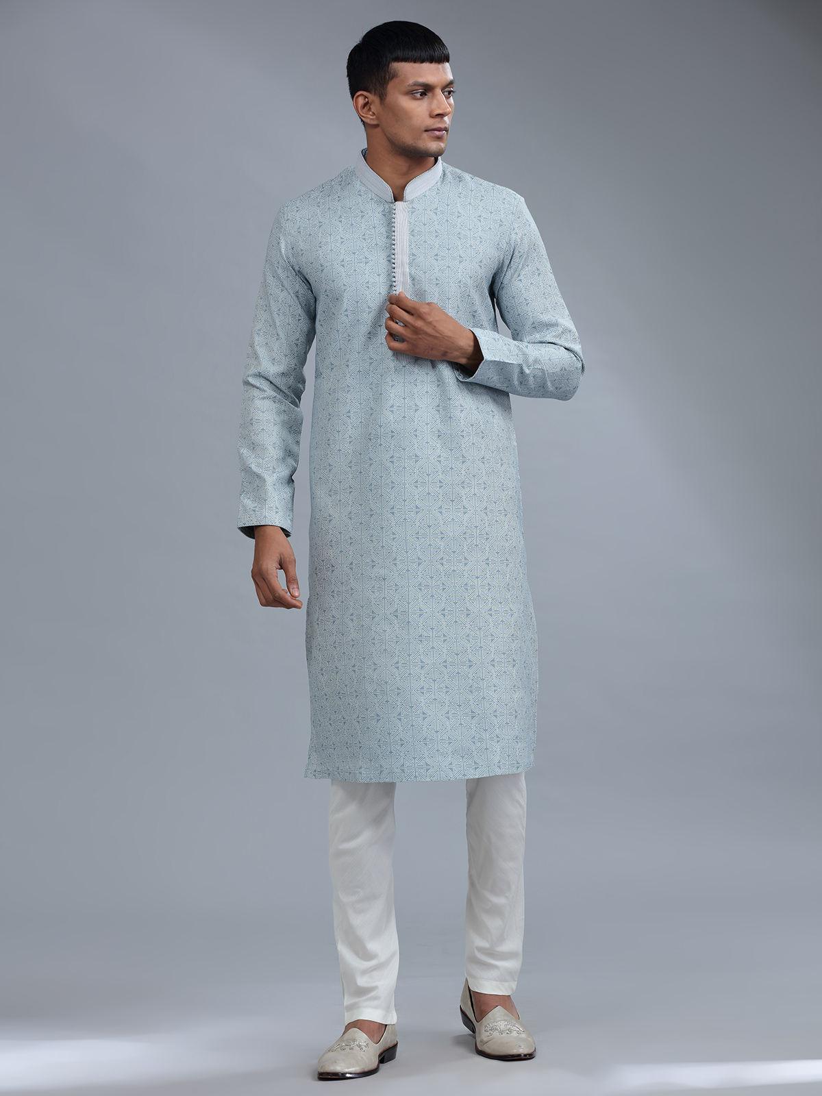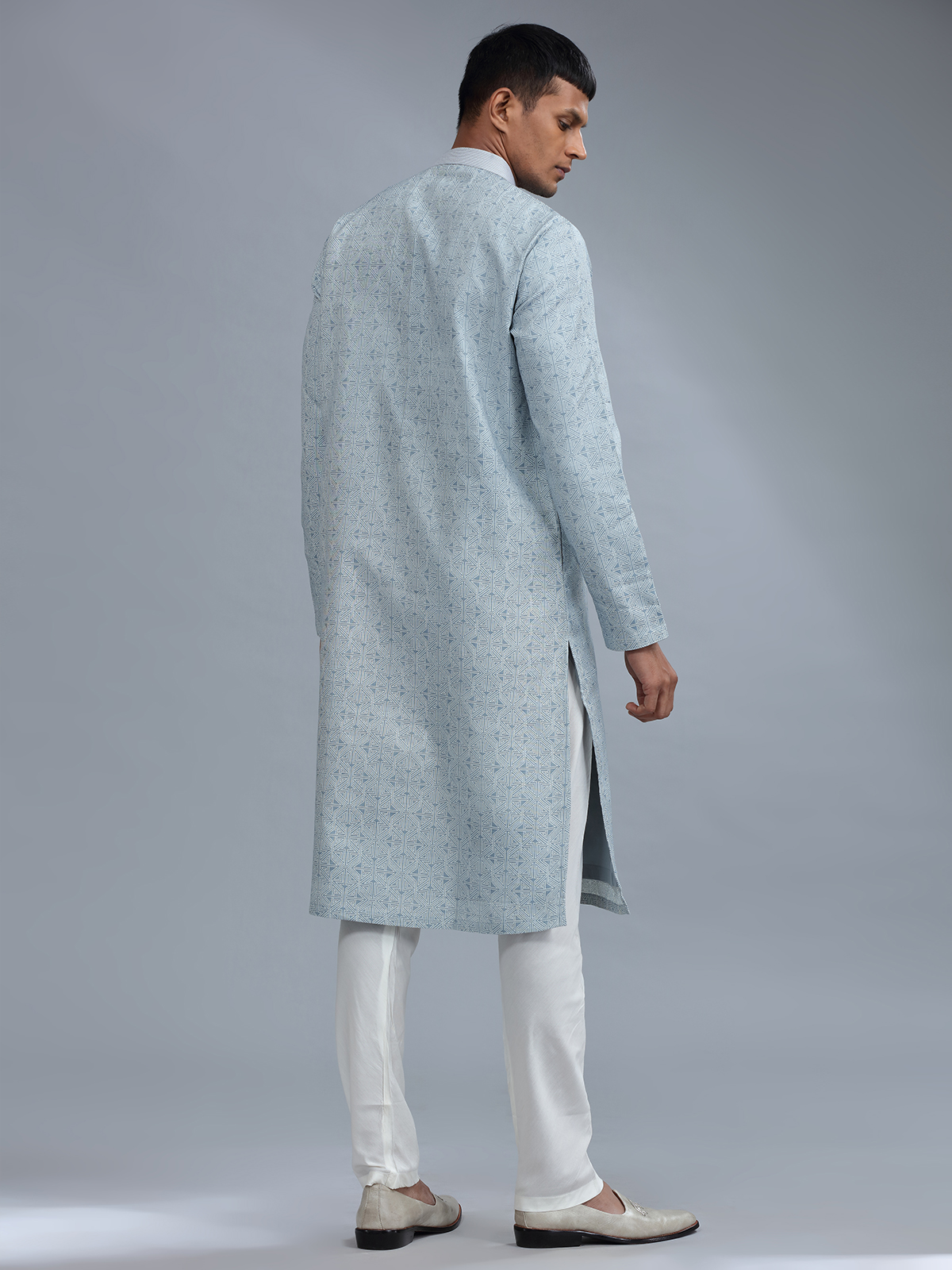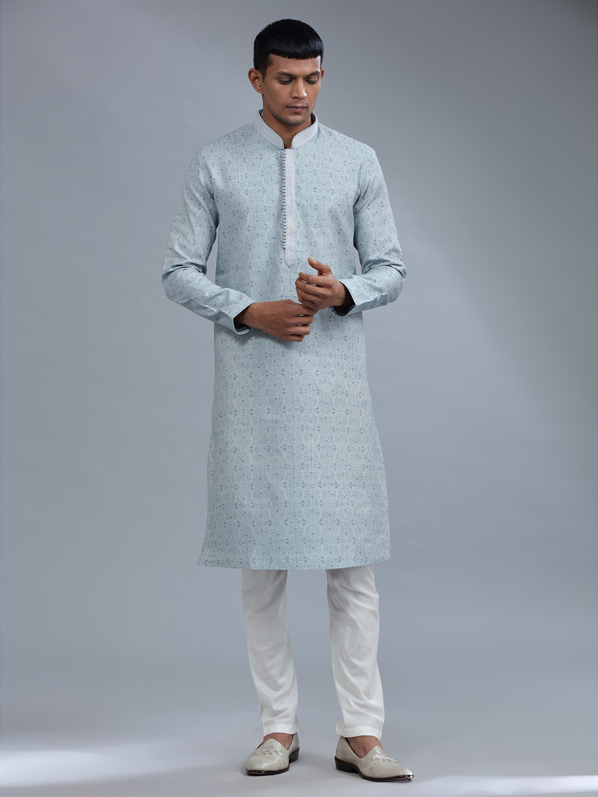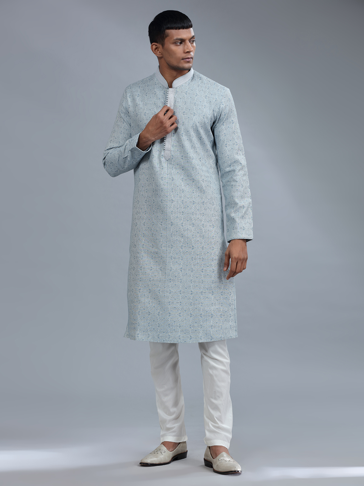 Refresh your ethnic wardrobe with our baby blue cotton silk kurta pajama. This outfit is delicately crafted with thread weaving, a mandarin collar, and full sleeves, exuding sophistication and charm. It comes with a bottom.