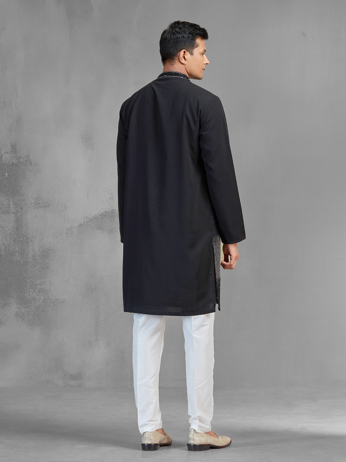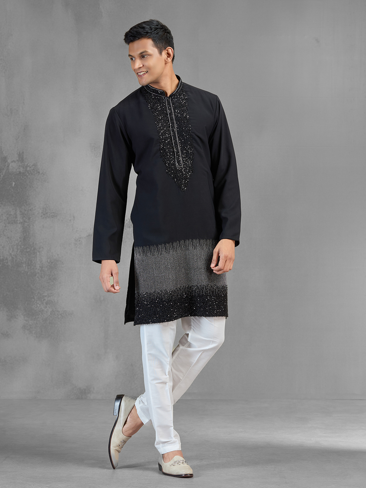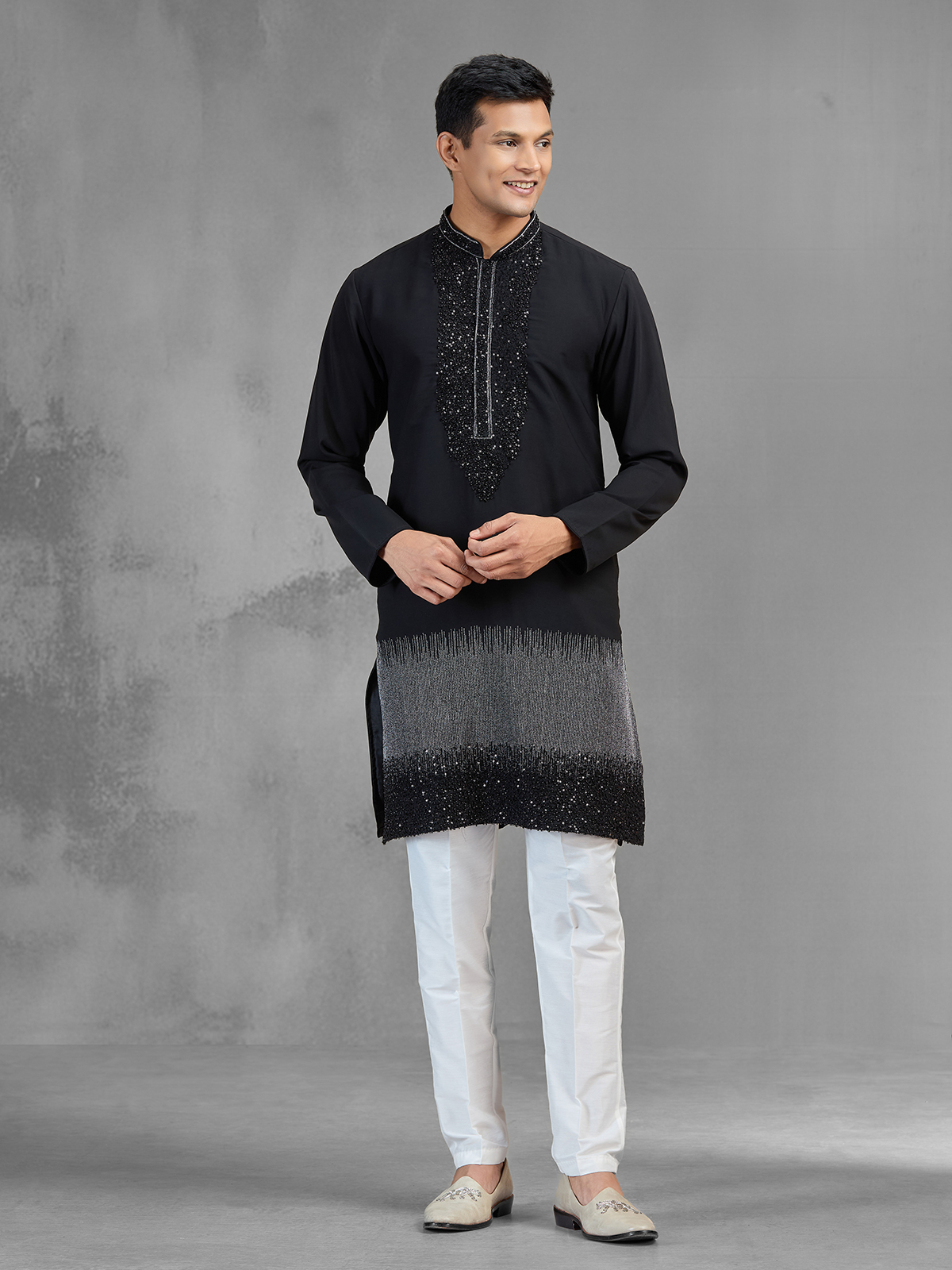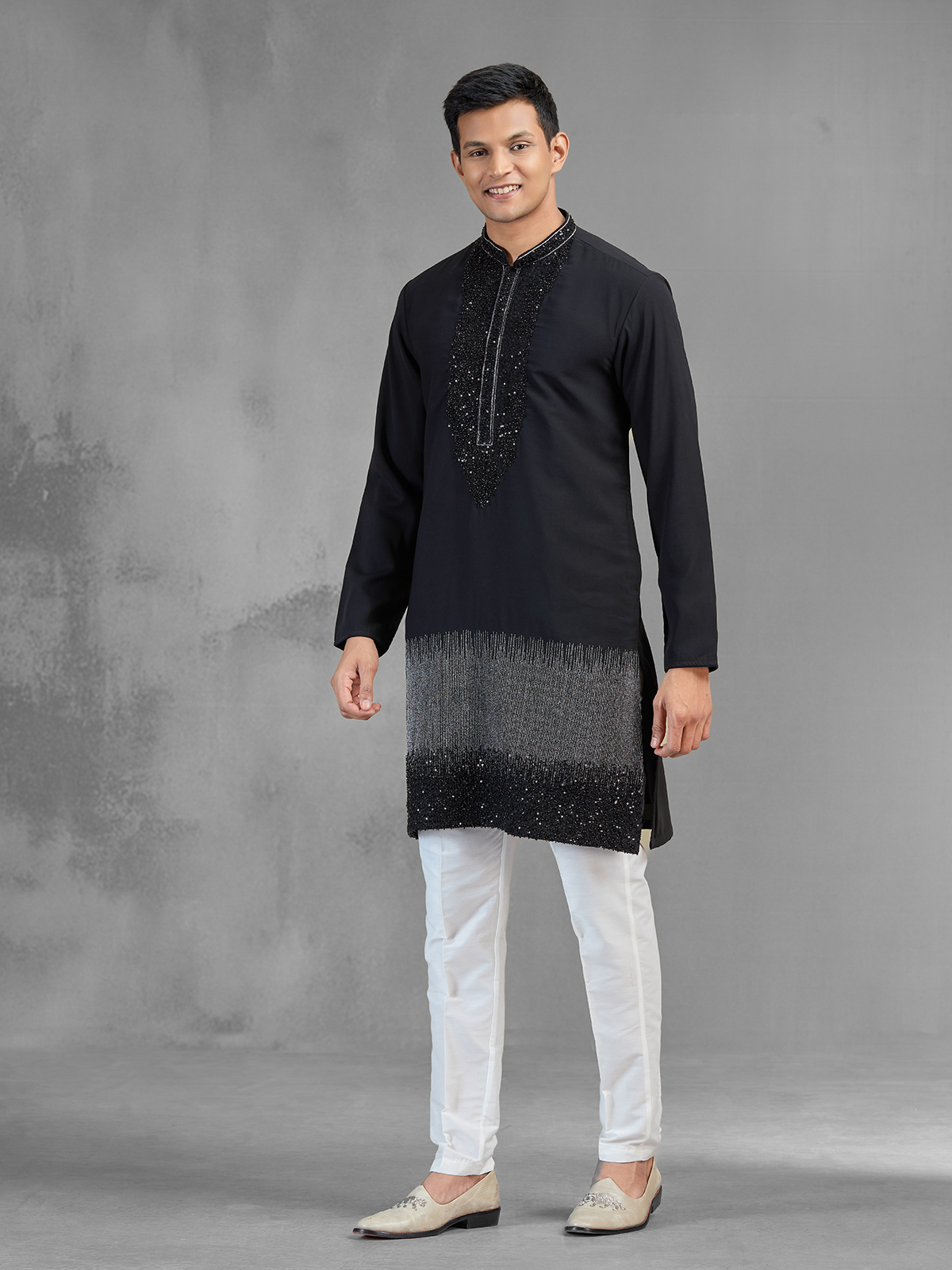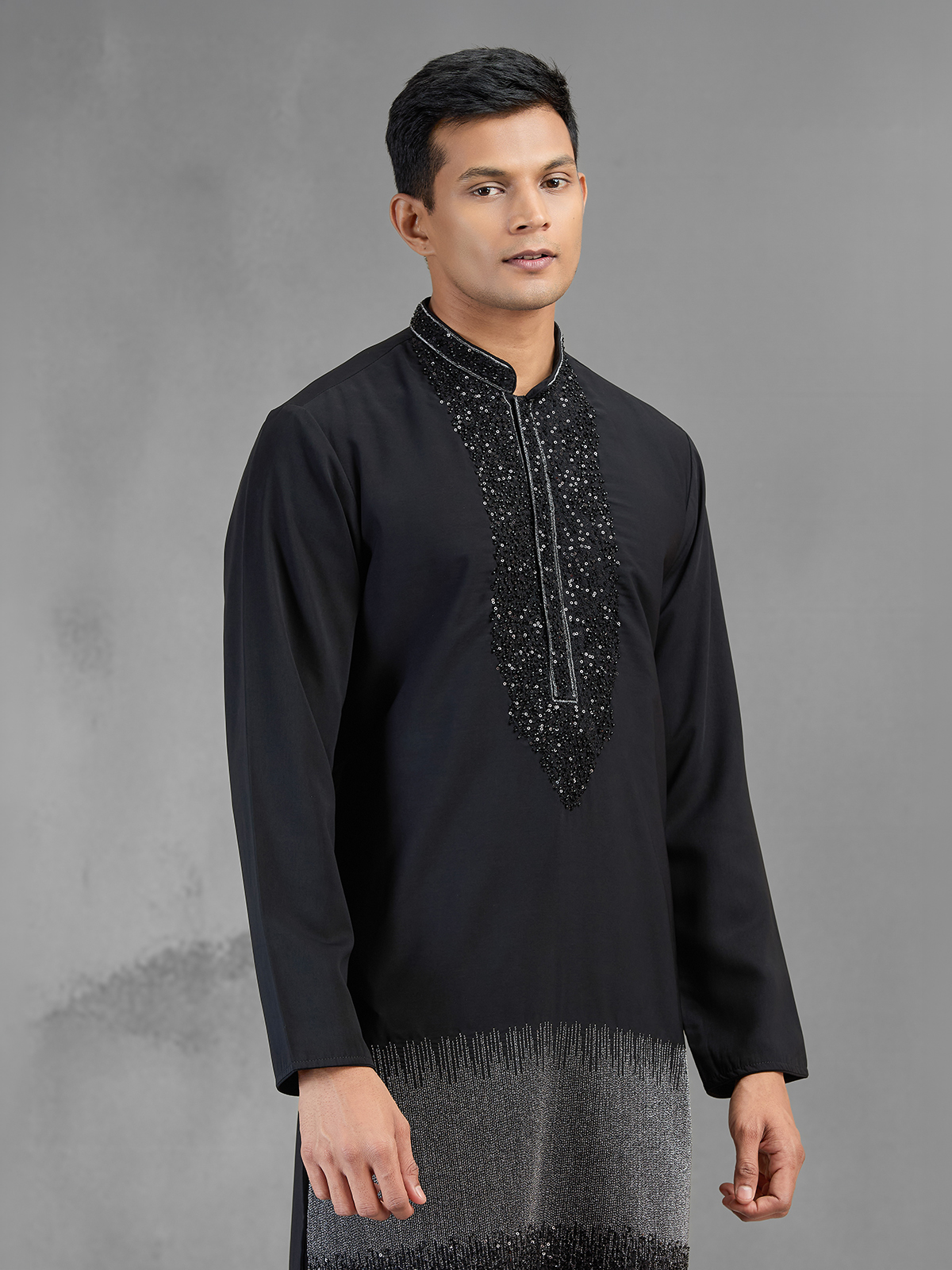This black Banarasi silk kurta suit blends classic richness with modern style through resham, sequins, beads and cutdana work. The refined ombre shading into grey tones adds visual depth. Designed with a chinese collar and full sleeves, paired with pants, it is perfect for weddings, receptions and evening events.