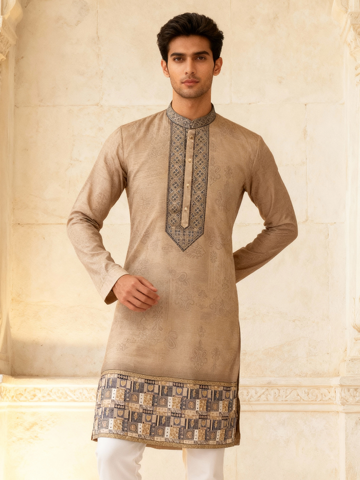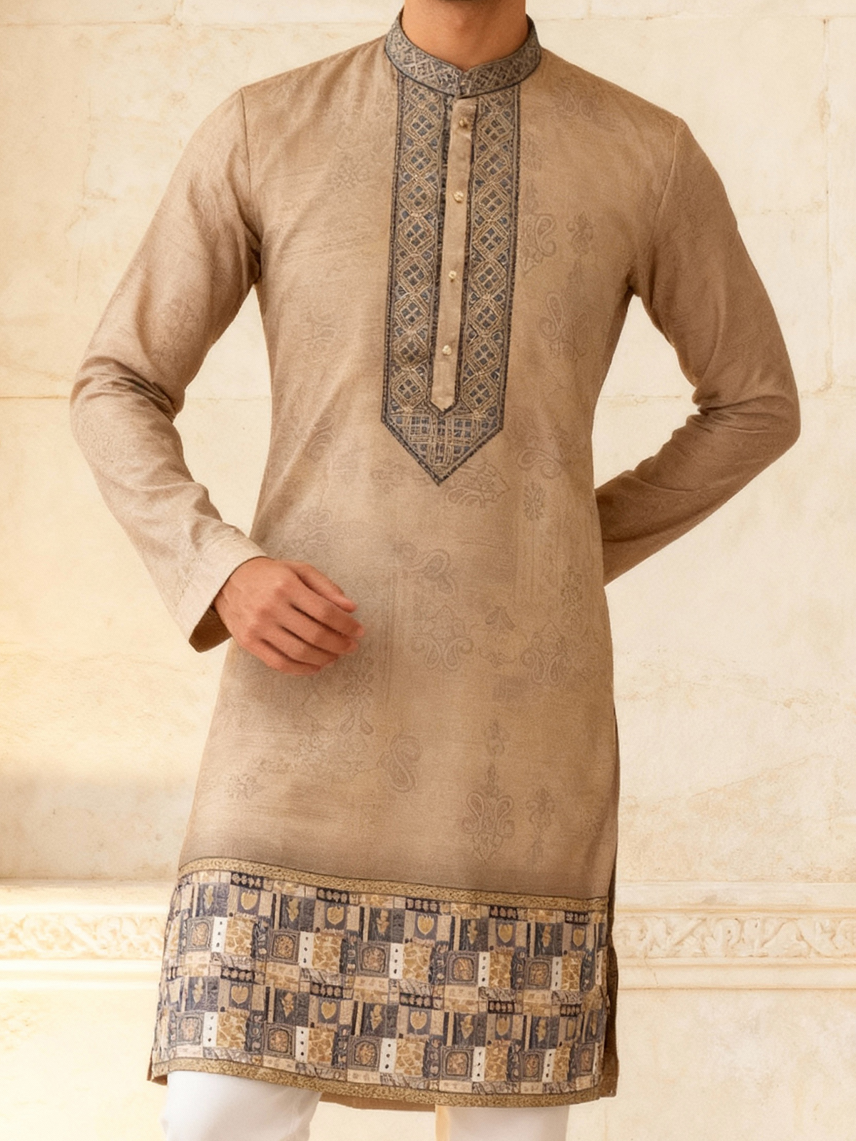 Refined and versatile, this beige cotton silk daman printed kurta balances traditional appeal with modern simplicity. The Chinese collar and full sleeves offer elegance, complemented by pants for festive occasions.