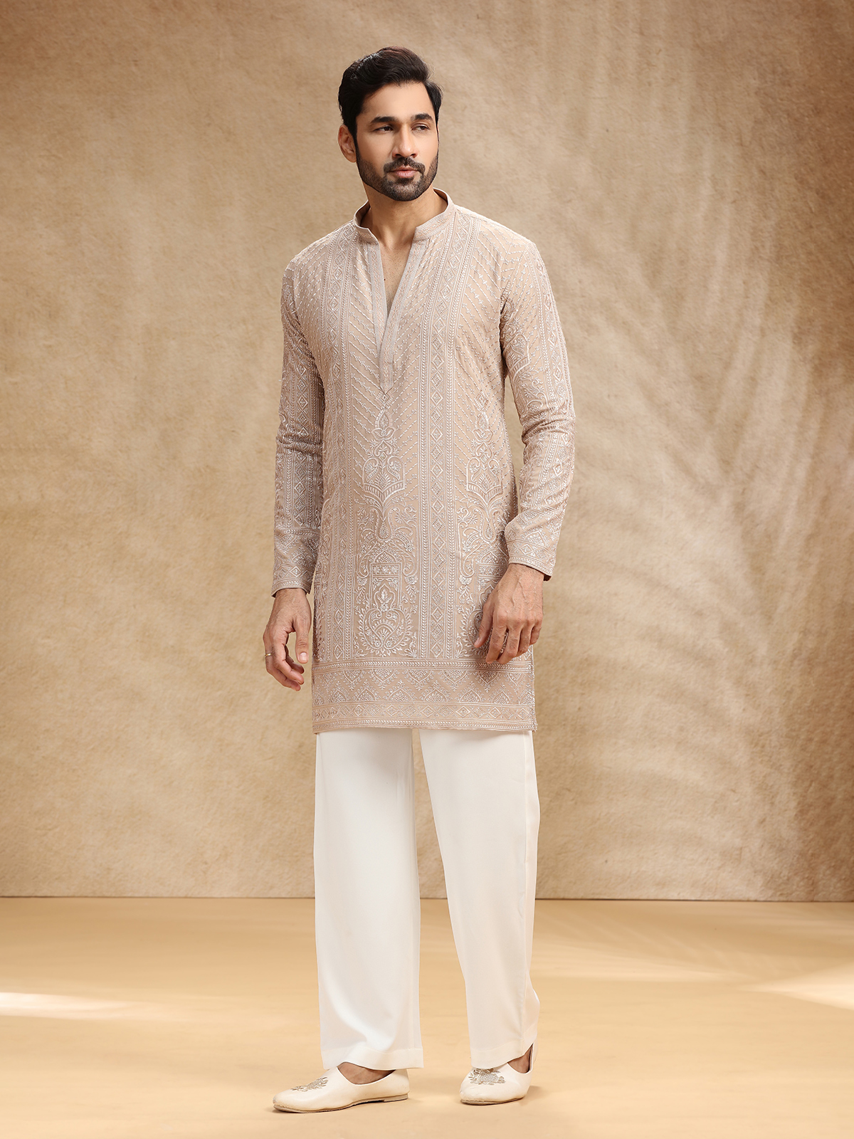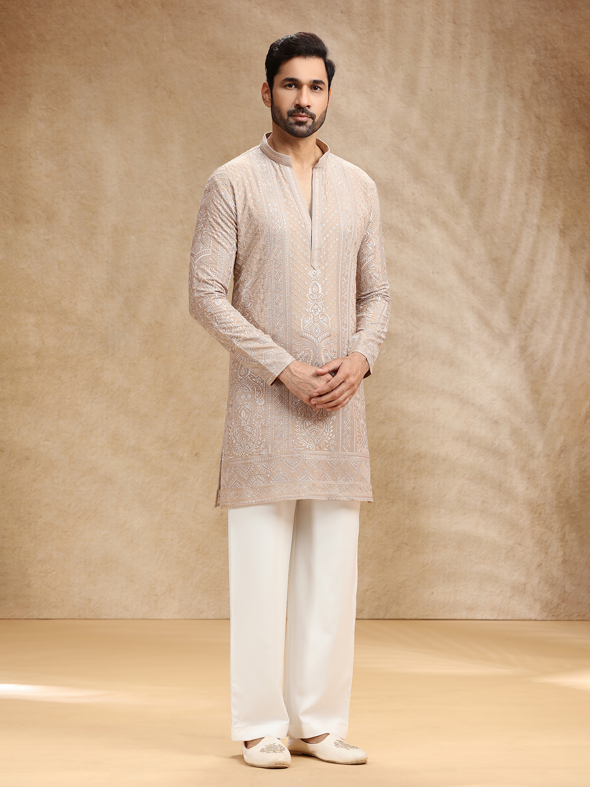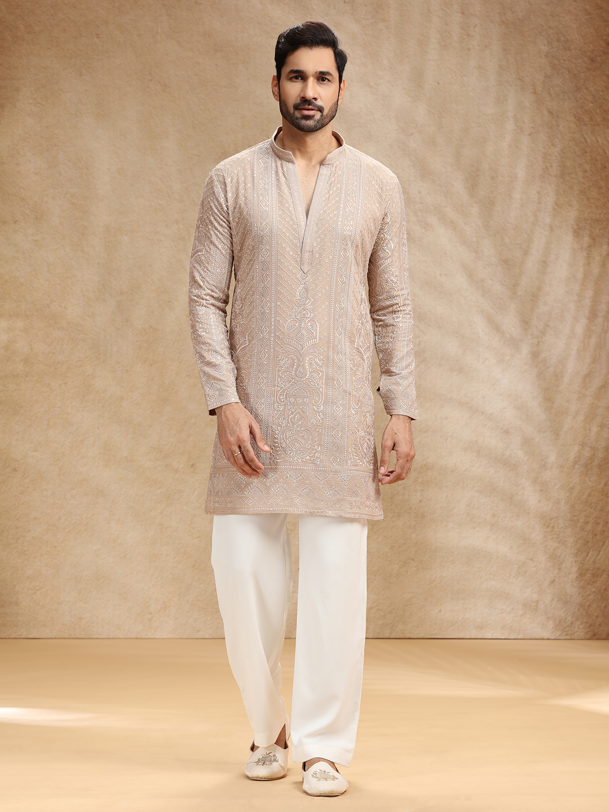 Elegantly crafted in beige georgette, this kurta suit glows with sequins and embroidery that add radiant festive charm. The stand collar and full sleeves lend graceful definition, while coordinating pants complete the refined ensemble. The warm beige tone, enhanced by luminous embellishments, makes it a versatile outfit for family gatherings and joyous cultural celebrations.