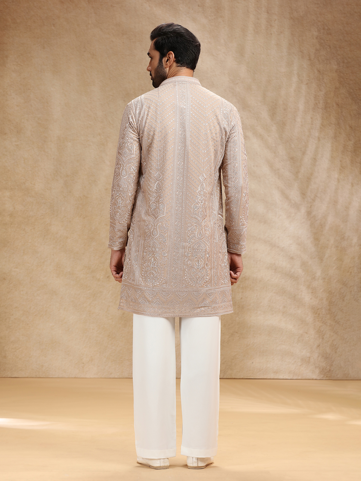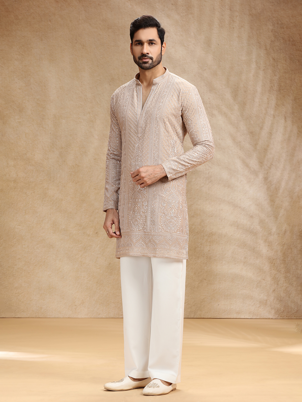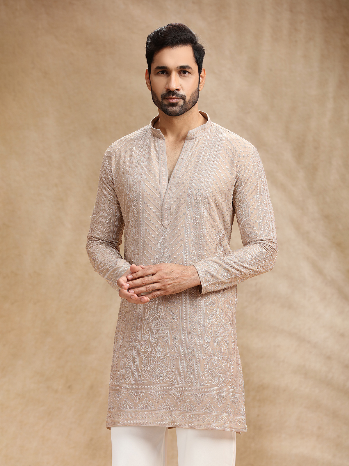 Elegantly crafted in beige georgette, this kurta suit glows with sequins and embroidery that add radiant festive charm. The stand collar and full sleeves lend graceful definition, while coordinating pants complete the refined ensemble. The warm beige tone, enhanced by luminous embellishments, makes it a versatile outfit for family gatherings and joyous cultural celebrations.