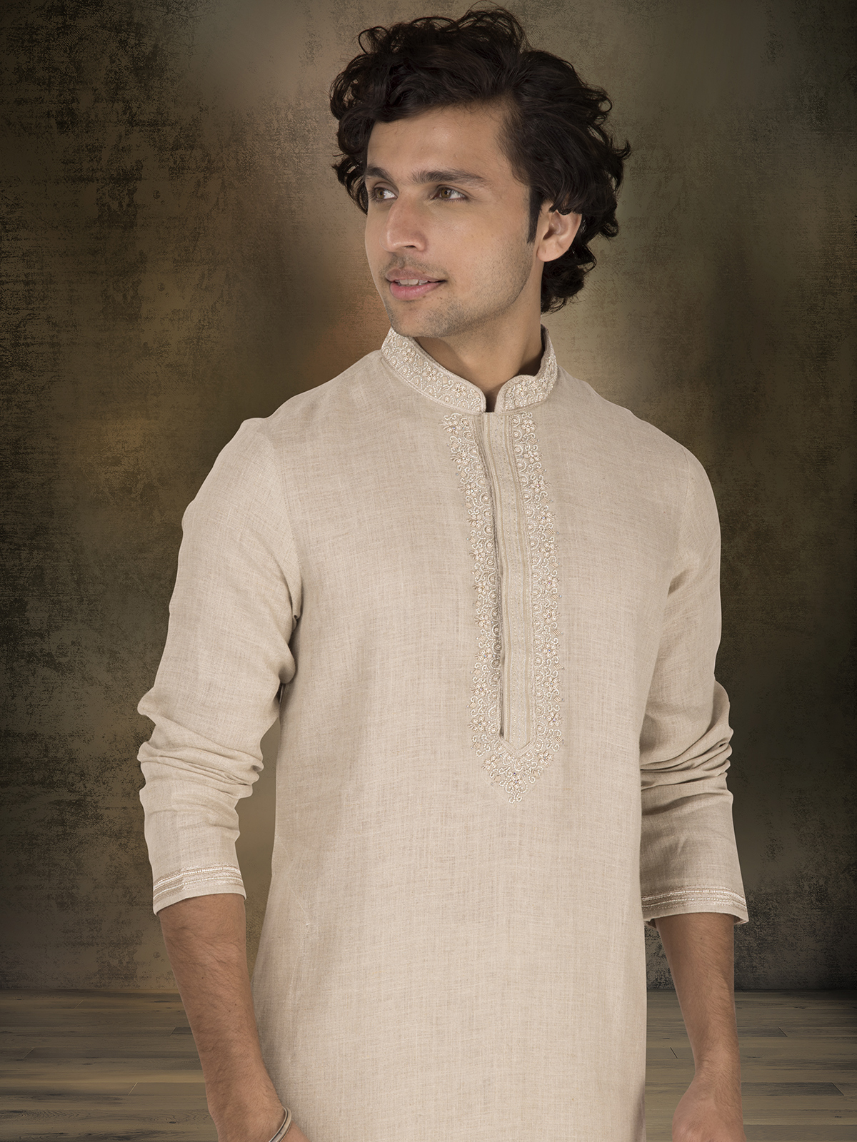 Tailored in pure linen beige, this kurta suit mesmerizes with cutdana, zardosi, beads, and stone embellishment. The mandarin collar and refined tailoring lend royal grace. Paired with pants, it’s ideal for wedding or festive occasions of dignified opulence.