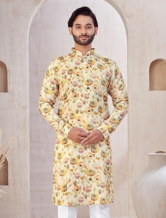 Celebrate in comfort and charm with this beige cotton kurta, highlighted by a colorful floral print. Full sleeves and a mandarin collar lend it a timeless appeal, while the matching bottom completes your chic festive ensemble.