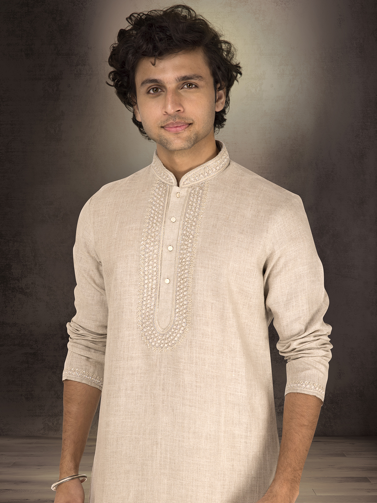 Designed in luxurious beige pure linen, this kurta suit gleams with thread, cutdana, and sequins artistry. The mandarin collar refines its regal silhouette, perfect for weddings and receptions. Paired with pants, it radiates quiet grandeur with timeless finesse.